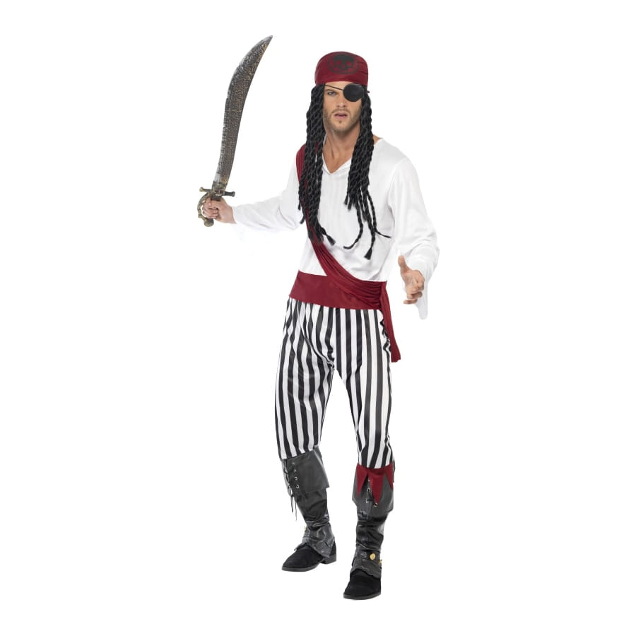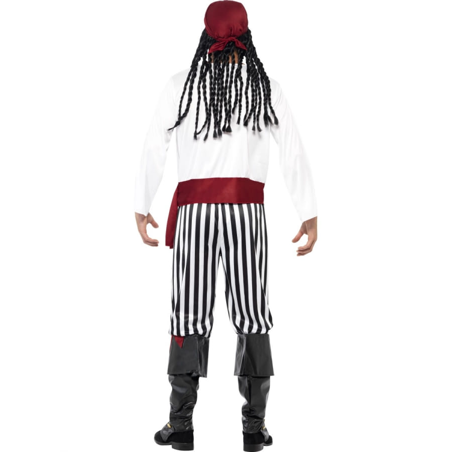 Ce costume de pirate vous pourrez le mettre pour une soirée sur le thème piraterie et corsaire ou encore pour le carnaval ou vous incarnerez un terrible pirate. Il est composé d'un top blanc, d'un pantalon à rayure noir et blanc, d'un bandeau noir, d'une ceinture et d'un foulard rouge.