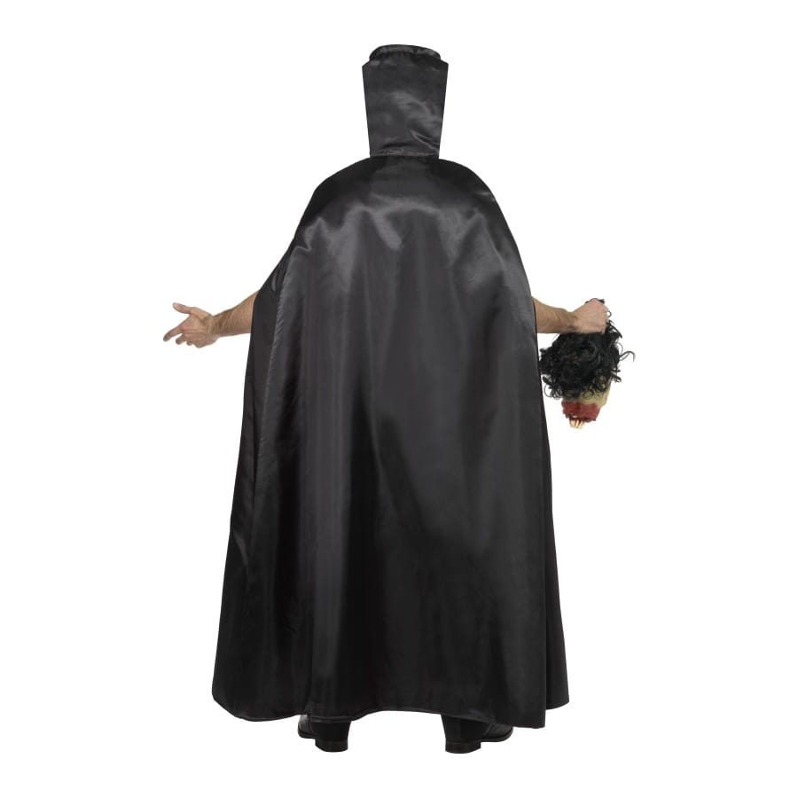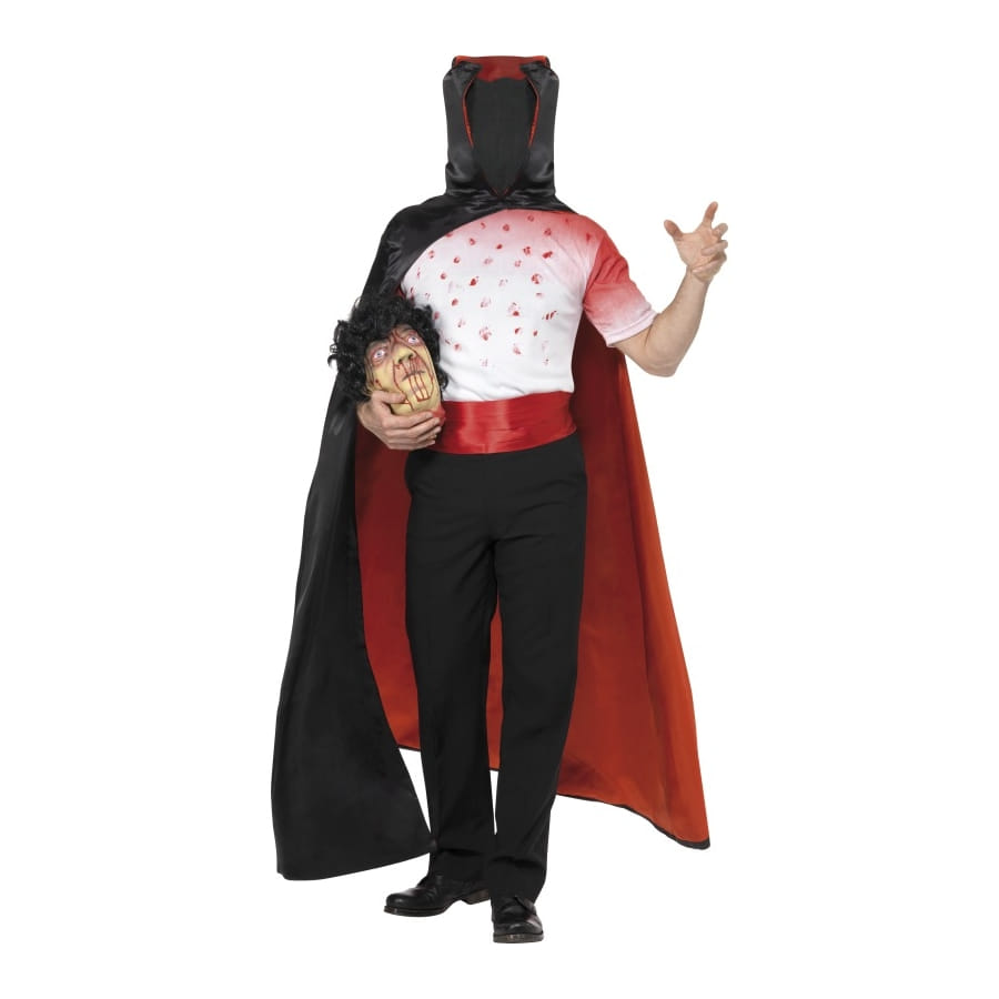 Déguisement d'homme sans tête, composé d'un t-shirt blanc tâché de sang, d'une cape noire à revers rouge, d'une ceinture rouge et d'une tête décapitée. Choisissez la taille des accessoires entre S, M ou L. Ce déguisement macabre fera un succès à l'occasion d'Halloween!