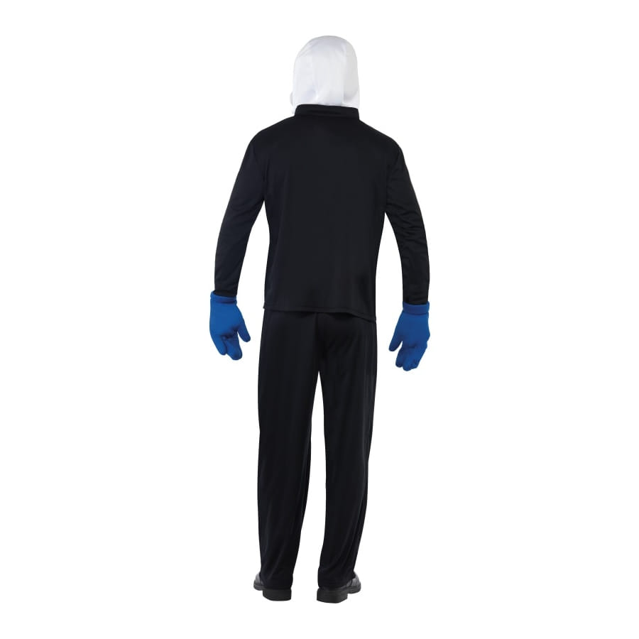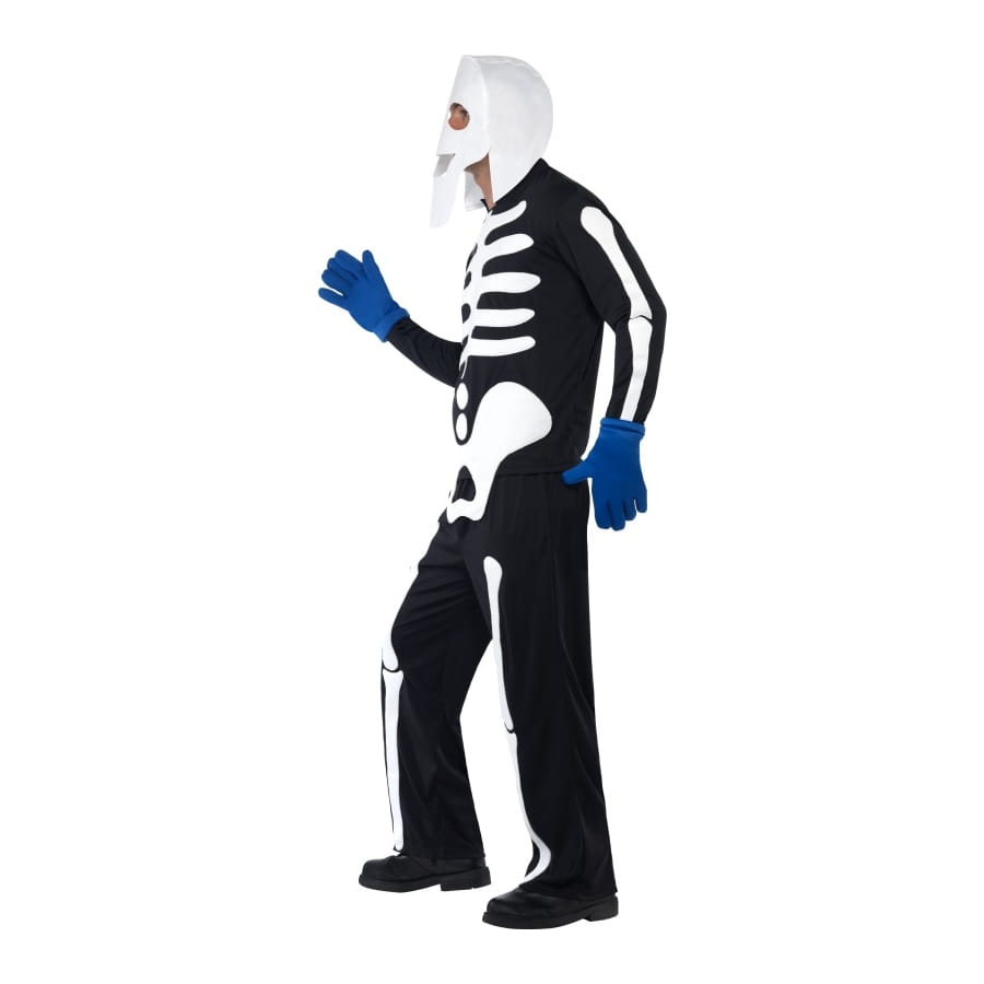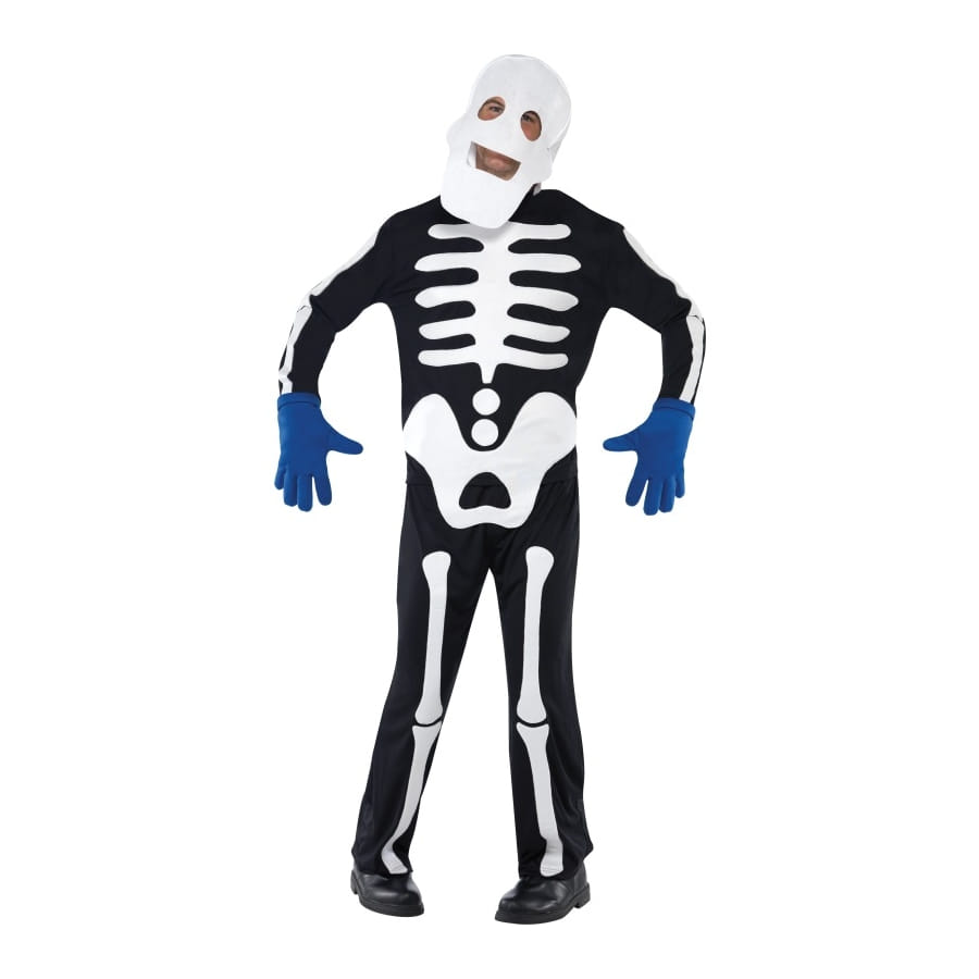 Déguisement de squelette, pour homme, composé d'un top, d'un pantalon, de gants bleues et d'un masque. Le top et le pantalon sont imprimés d'un squelette blanc sur fond noir. Ils sont disponibles en taille S, M ou L. C'est un déguisement parfait pour Halloween.