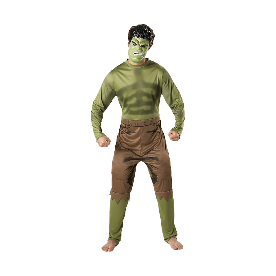 Déguisement de Hulk sous licence, pour homme, composé d'une combinaison marron et verte. Cet ensemble est parfait pour une soirée d'Halloween ou pour une fête basée sur le thème des dessins animés.