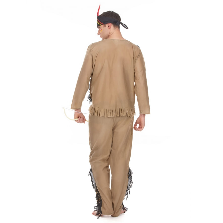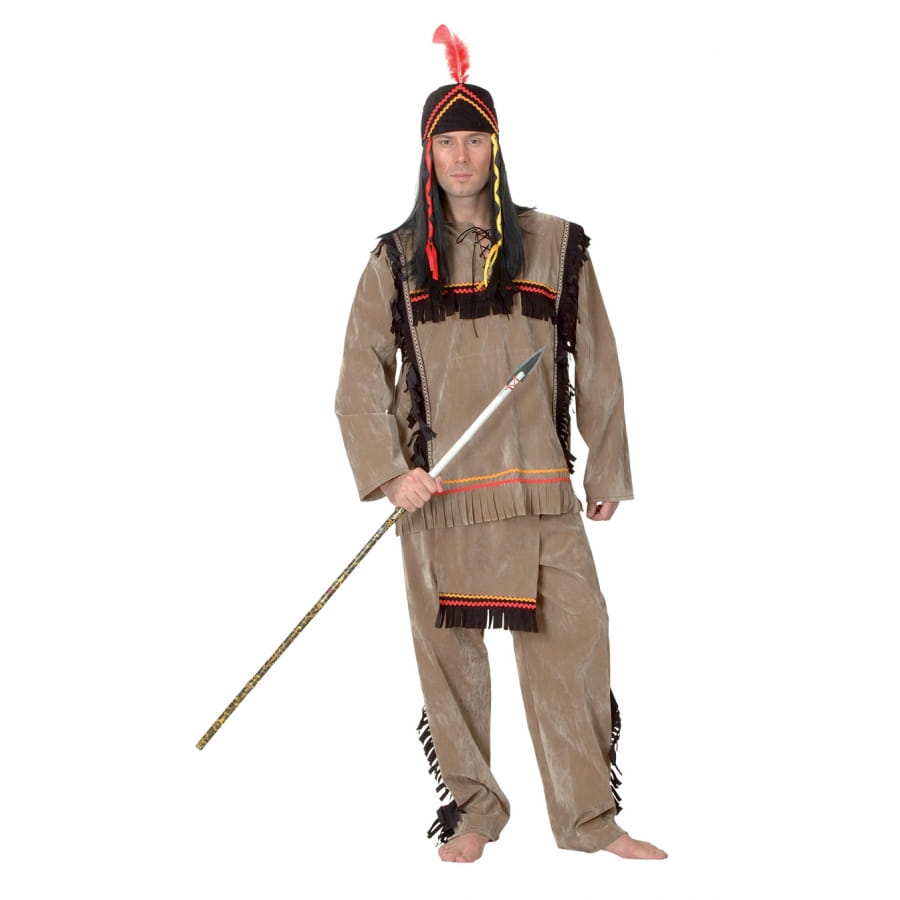 Changement d'atmosphère ! Si les indiens d'Amérique ne peuvent pas venir à vous, vous pouvez emmener un peu de leur culture à une soirée déguisée. Ce déguisement indien marron clair effet velours est un excellent moyen de faire découvrir le code vestimentaire traditionnel des indiens à vos amis. Il est formé par une tunique beige à effet velours ornée de franges marron disposés le long du corps et sur la poitrine, ainsi que de bandes de couleur orange et jaune. Il s'agit d'un vêtement à manches longues, équipé d'une ficelle à l'encolure pour l'ajuster. Le pantalon est élastique à la taille, et de couleur beige à effet velours. En guise de coiffe indienne, vous aurez droit à un bandeau marron avec liseré rouges et jaunes tombants. Retrouvez aussi une jolie plume rouge placée au sommet de l'accessoire. Votre nouveau déguisement vous fera honneur lors d'un carnaval.