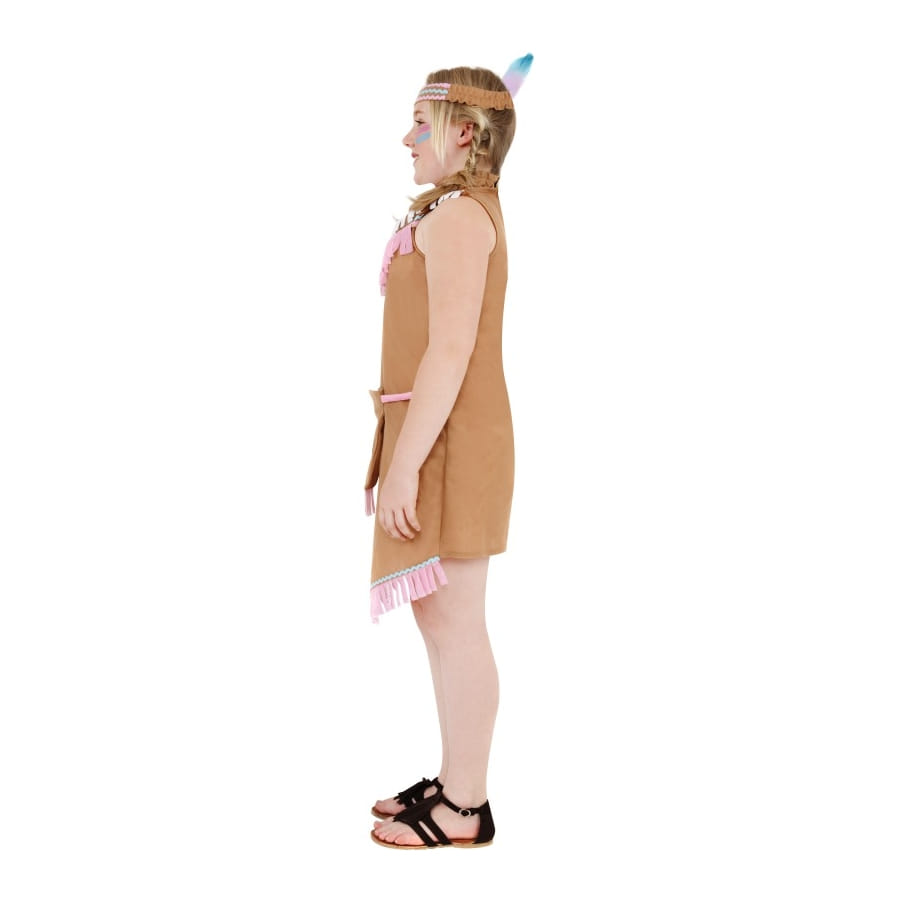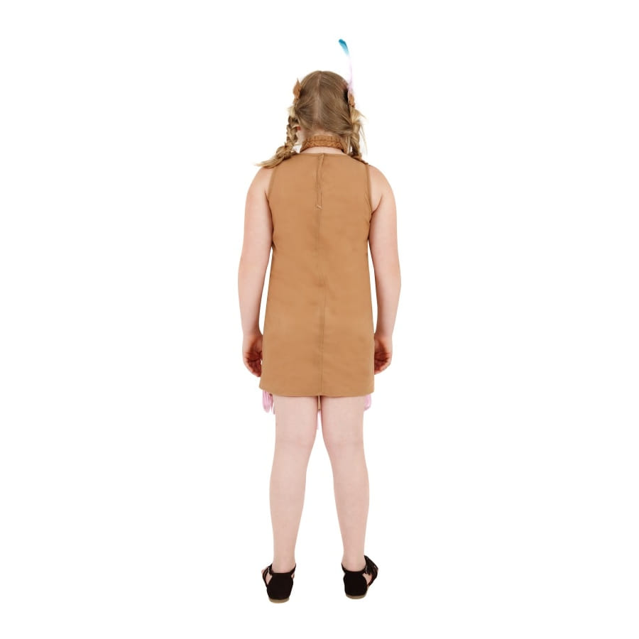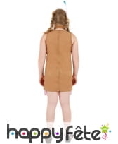 Déguisement d'indienne, pour fille, composé d'une robe et d'un bandeau. La première est de couleur marron avec des franges assorties tandis que le bandeau est orné d'une petite plume bleu. Le tout est disponible en taille S, M ou L au moment de la commande. Il fera de vous une petite Indienne inoffensive et mignonne.