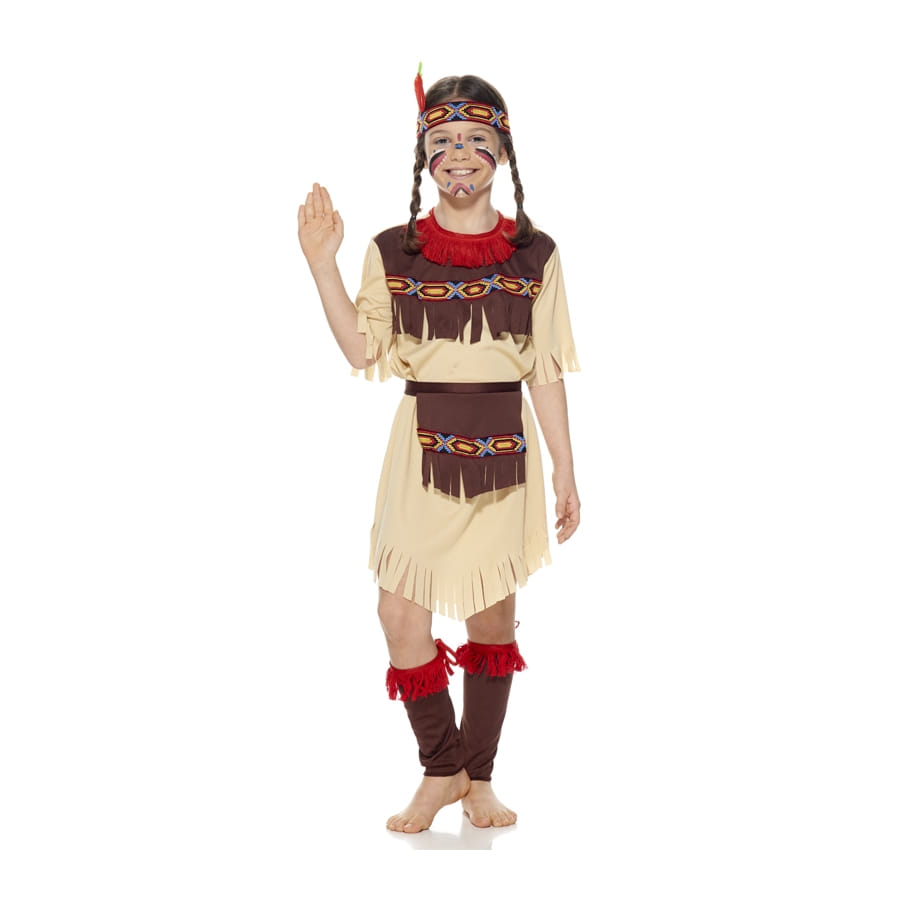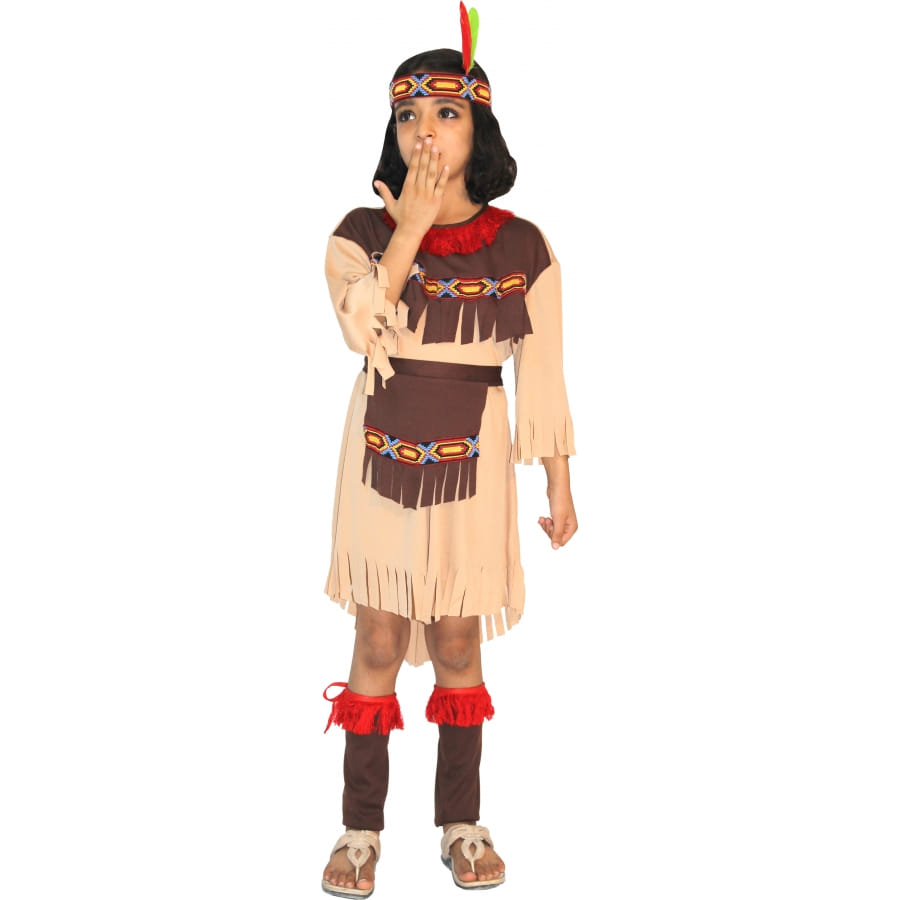 Déguisement de "Yuta", pour fille, composé d'une robe, d'un tablier, de guêtres, d'une ceinture et d'une coiffe. Le tout est un mélange de rouge, de jaune et de marron. La coiffe est ornée de plumes rouge et vert fluo. Au moment de votre commande, choisissez entre une taille 116, 128 ou 140. Votre fille se transformera en parfaite Indienne d'Amérique!