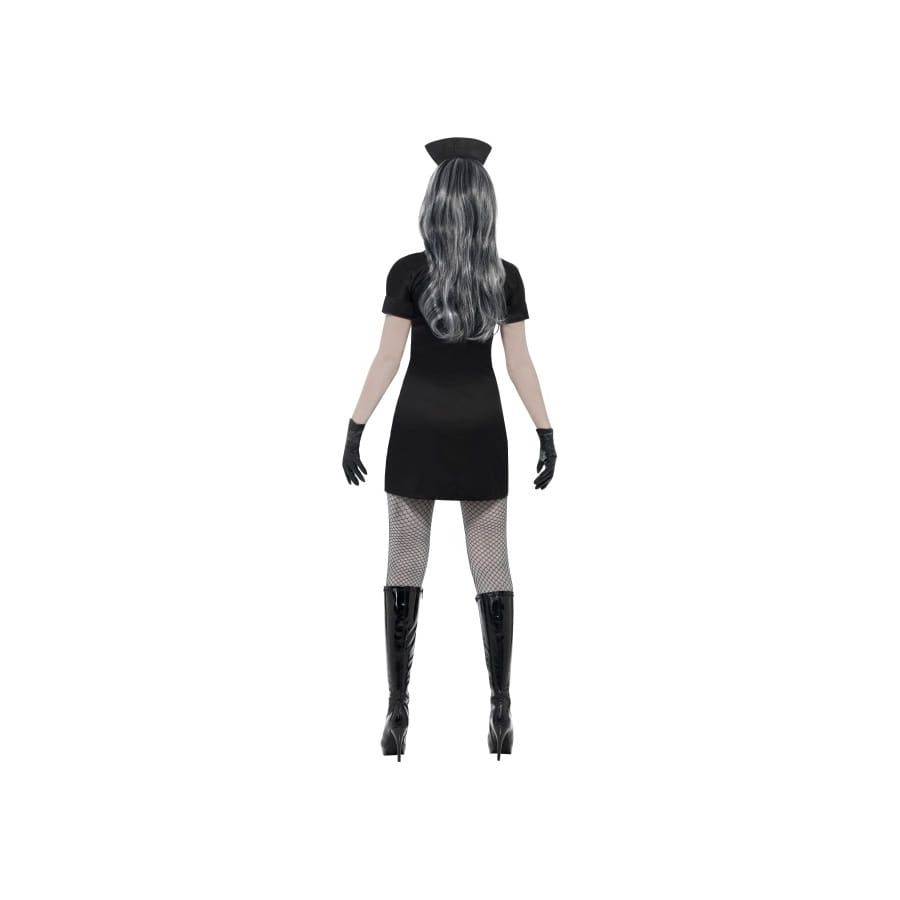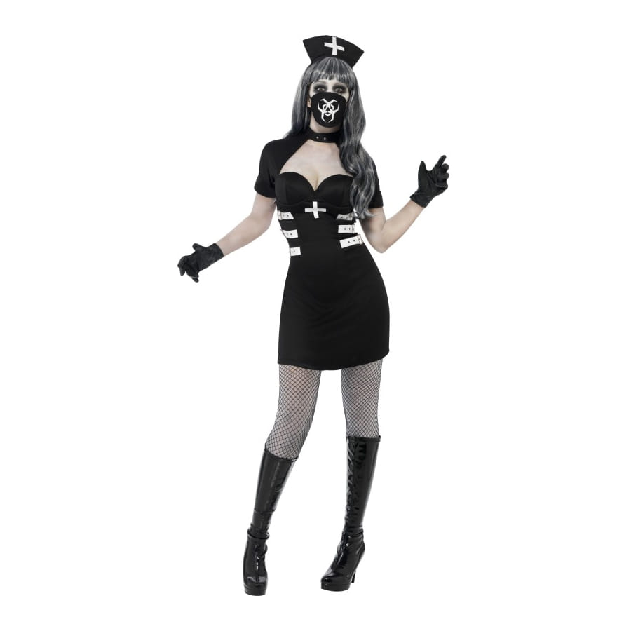 Déguisement d'infirmière Asylum, pour femme, comprenant une mini-robe noire et lanche avec veste attachée, d'une paire de gants noirs courts, d'une coiffe noire avec croix blanche et d'un masque noir et blanc. Ce déguisement étrange est disponible en taille S, M ou L. Il est à la fois sexy et effrayant, idéal pour mettre mal à l'aise et effrayer votre entourage.