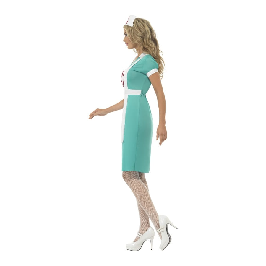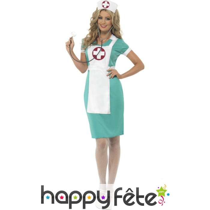 Costume d'infirmière du bloc opératoire, pour femme. Cet ensemble comprend une robe avec faux tablier et une coiffe. La robe est de couleur verte, le tablier blanc avec une croix rouge, assorti à la coiffe. Le tout est disponible en taille S, M ou L. La taille S offre une robe de taille 36-38, la M une robe 40-42 et la L une robe 44-46. C'est le déguisement parfait pour une soirée déguisée.