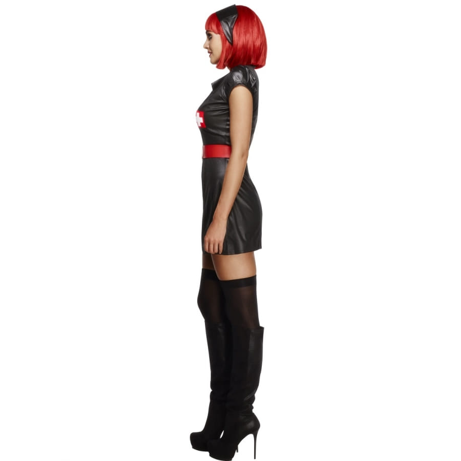 Avec ce costume d'infirmière tout le monde voudra vous approcher. Ce costume est de couleur noir et rouge. Vous pourrez le porter pour la saint valentin. Ce déguisement est une robe manche courte avec une croix blanche. La robe est courte, il est aussi composé d'une ceinture rouge ainsi que d'un calot. Vous serez torride et sexy avec.