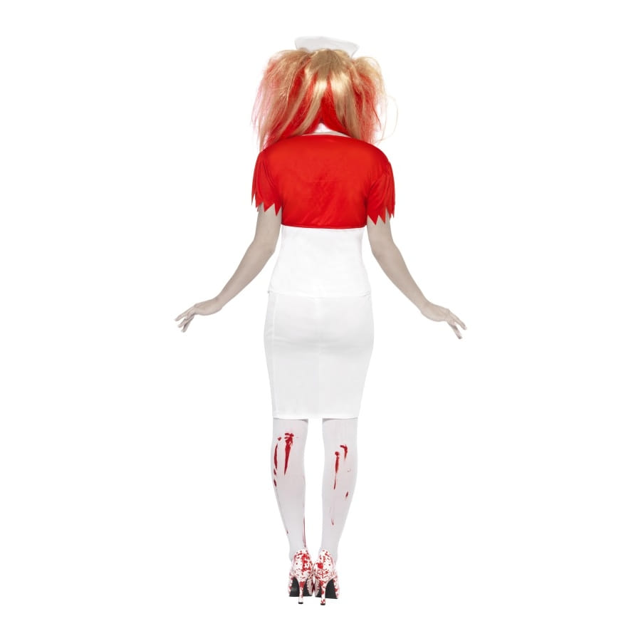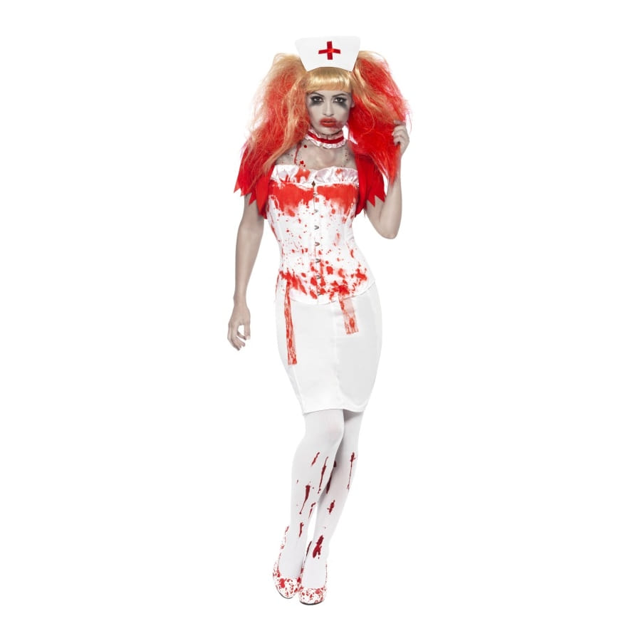 Déguisement d'infirmière sanglante, pour femme, composé d'une jupe blanche, d'une veste boléro, d'un corset, d'un collier et d'une coiffe d'infirmière. Tous les accessoires sont tâchés de sang et disponibles en taille S, M ou L. Malgré le côté horrifiant du déguisement, il vous rendra tout de même très sexy.