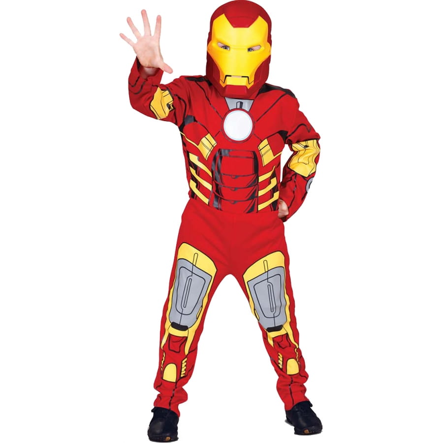 Déguisement d'Iron Man composé d'une combinaison imprimée grise, jaune et rouge et d'un masque souple assorti. Cet ensemble est disponible en taille S, M ou L pour enfant de 7 à 8 ans. Vos enfants seront ravis de ce costume.