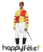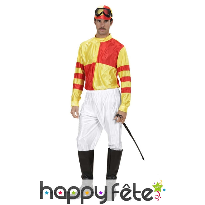 La tenue comporte un haut à manches longues de couleur rouge et jaune, un pantalon blanc en tissu léger et satiné, une paire de surbottes noires, une casquette de jockey arborant les mêmes couleurs que le haut, et enfin, une paire de lunettes spécial cavalier.