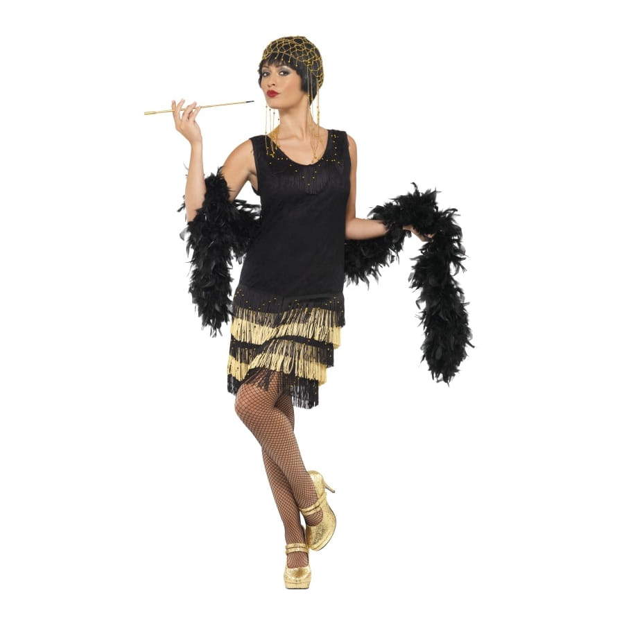 Déguisement de jeune fille délurée des années 20, pour femme, composé d'une robe frangée noire et dorée. Cet accessoire de déguisement est disponible en taille S, M ou L. Ajoutez-y un boa à plumes et vous serez une parfaite dame libérée des années Charleston.