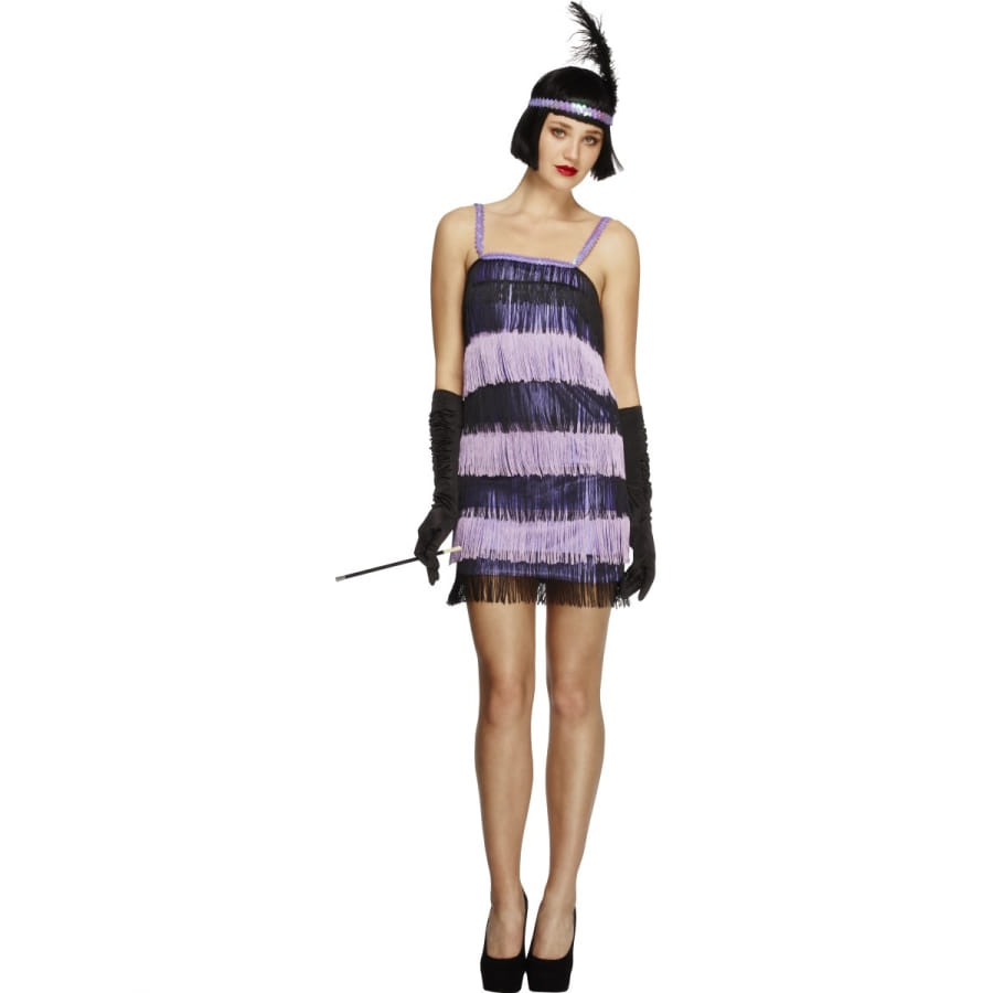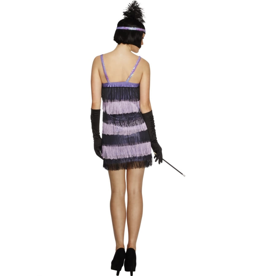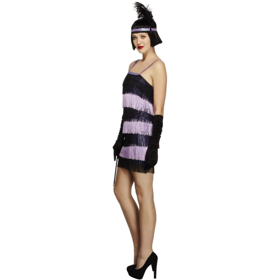 Ce déguisement vous pourrez le porter pour une fête comme les années 20 ou encore a un enterrement de vie de jeune fille. Ce joli costume est composé d'une robe de couleur mauve avec des franges dessus et un serre-tête avec une plume au centre.