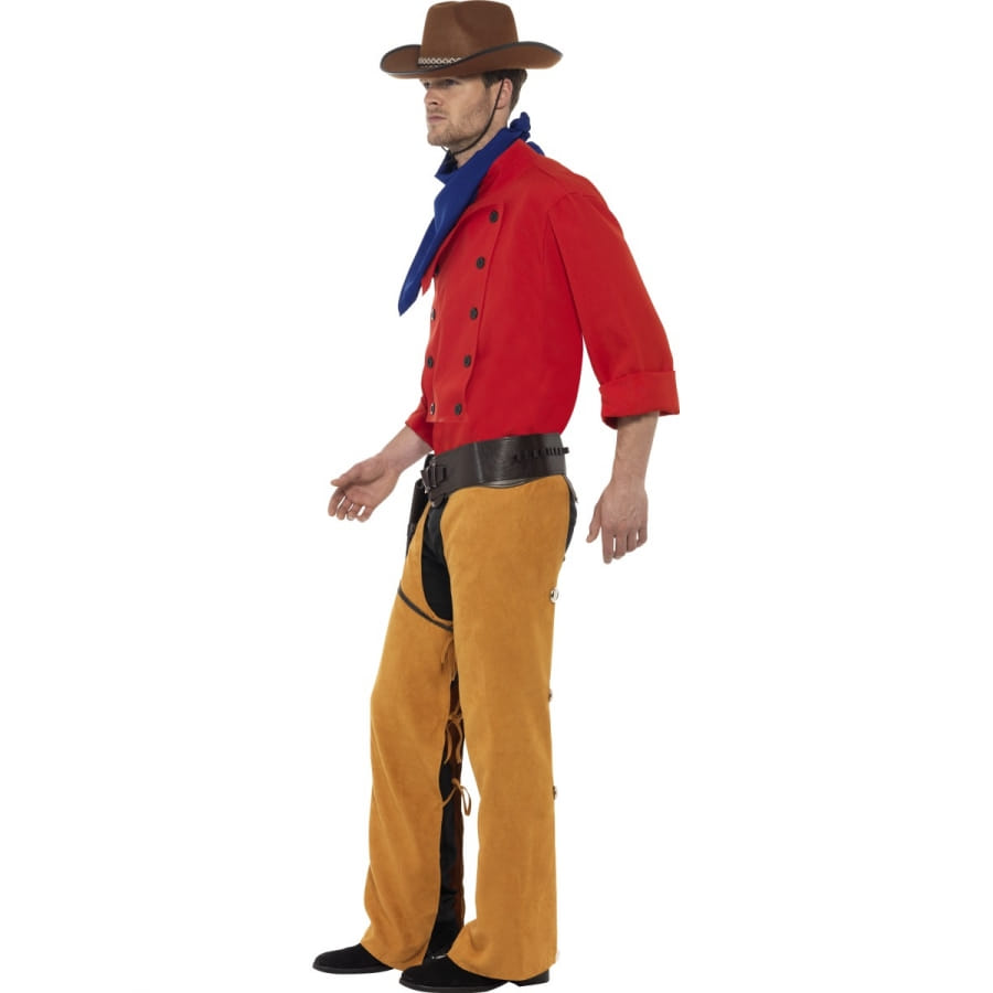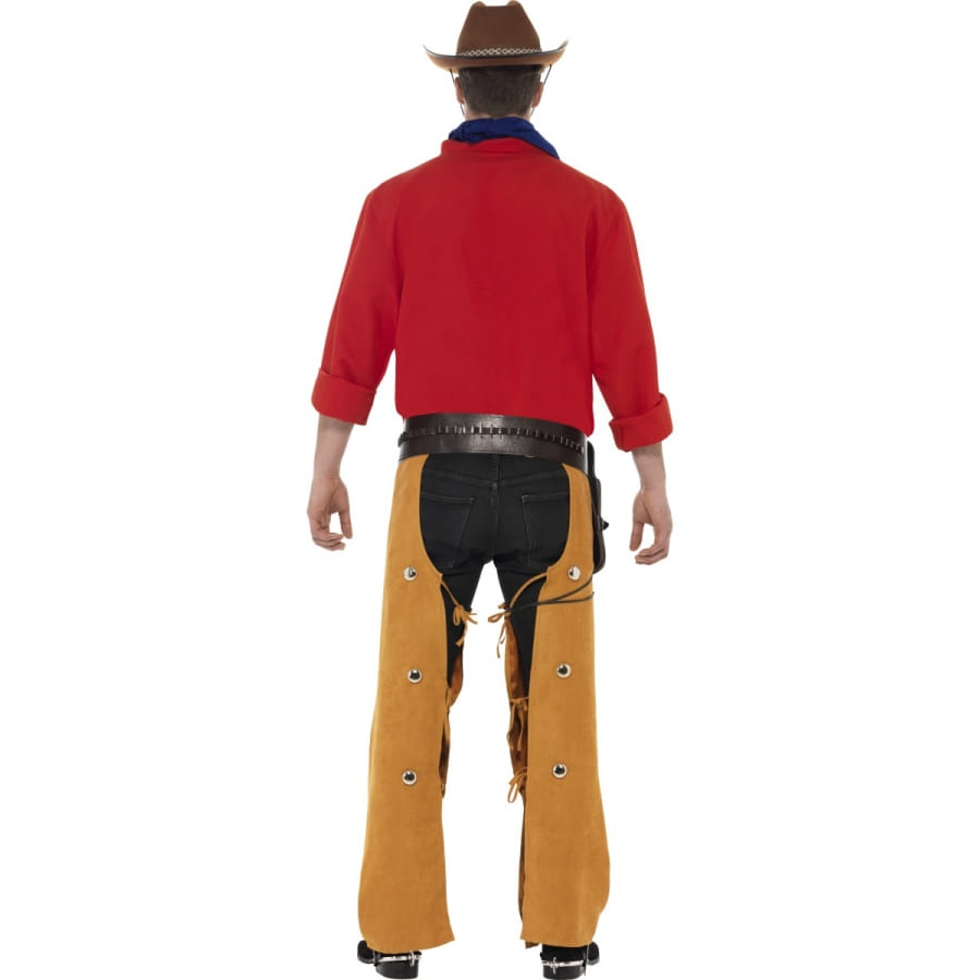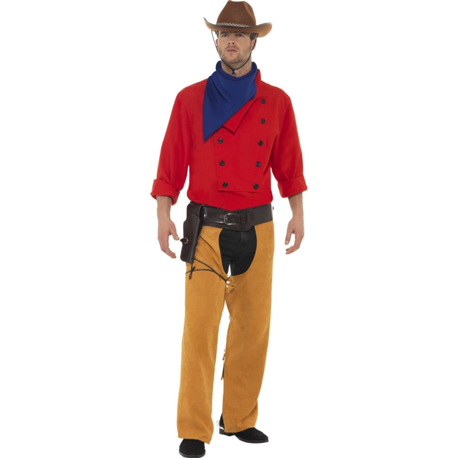 Ce déguisement vous pourrez la porter pour le carnaval ou encore pour un enterrement de vie de garçon. Vous pourrez le porter aussi pour un thème western. Ce déguisement est composé d'un chapeau noir, d'une veste rouge, d'un foulard bleu, de jambière de cuir de couleur beige et d'un étui de révolver.
