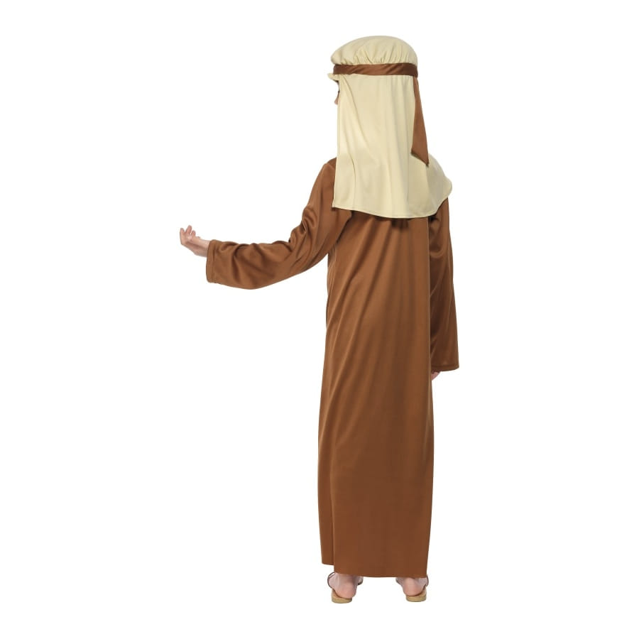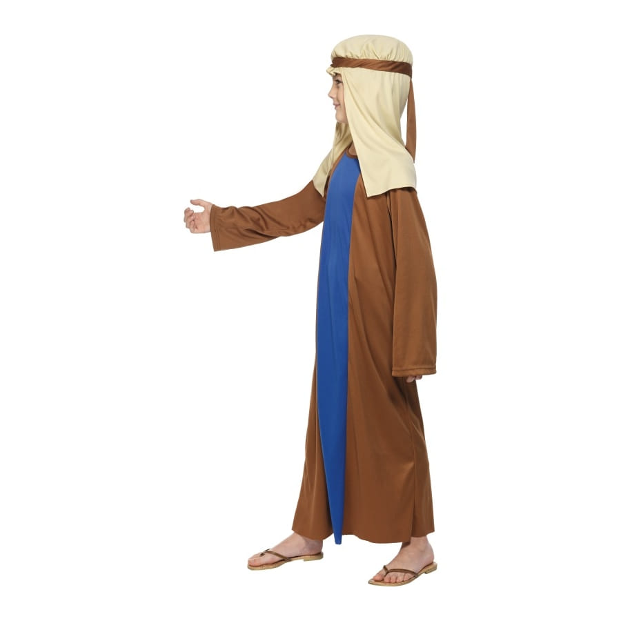Déguisement de Joseph, pour enfant, composé d'une robe marron et bleue et d'un chapeau beige. Cet ensemble est disponible en taille S, M ou L. Vous pourrez déguiser votre enfant en personnage religieux pour un spectacle de Noël.