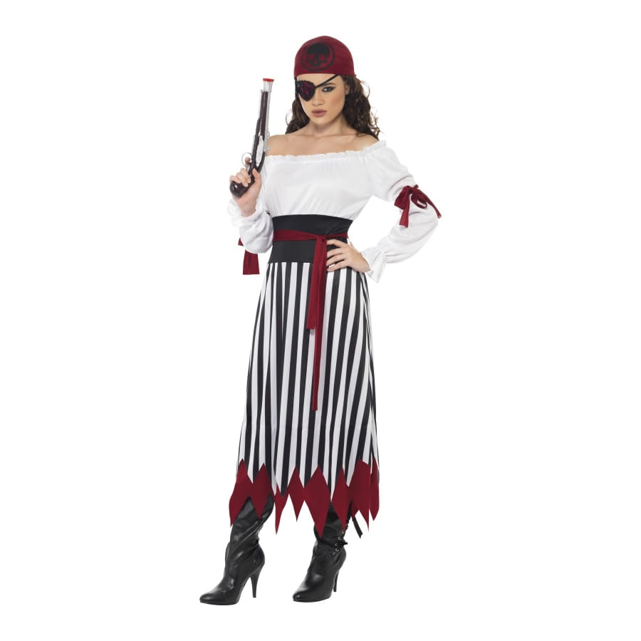 Déguisement de Lady Pirate, pour femme, composé d'une robe, d'une ceinture noire et rouge et d'une foulard pour cheveux assorti. La robe, à manches longues, est de couleur blanche avec une jupe à rayures avec bordure rouge. Ces accessoires seront disponibles en taille S, M ou L au moment de la commande. Cet ensemble est idéal pour une fête basée sur le thème de pirates!