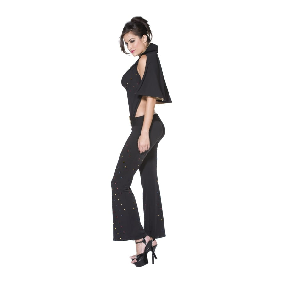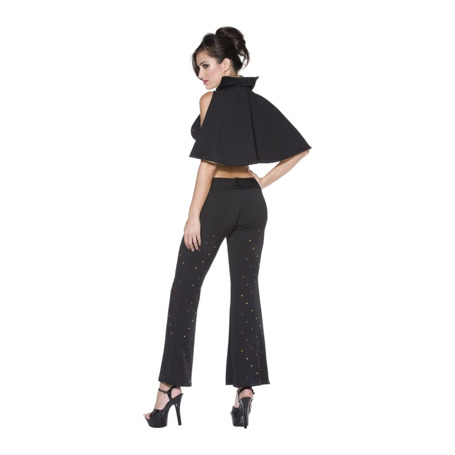 Déguisement de couleur noire inspiré de Las Vegas, pour femme, composé d'une combinaison, d'une cape et d'une ceinture. Les trois accessoires sont paillettés, la combinaison contenant un grand col doré assorti au revers de la cape et à la boucle de la ceinture. Devenez un personnage glamour pour une fête de folie!