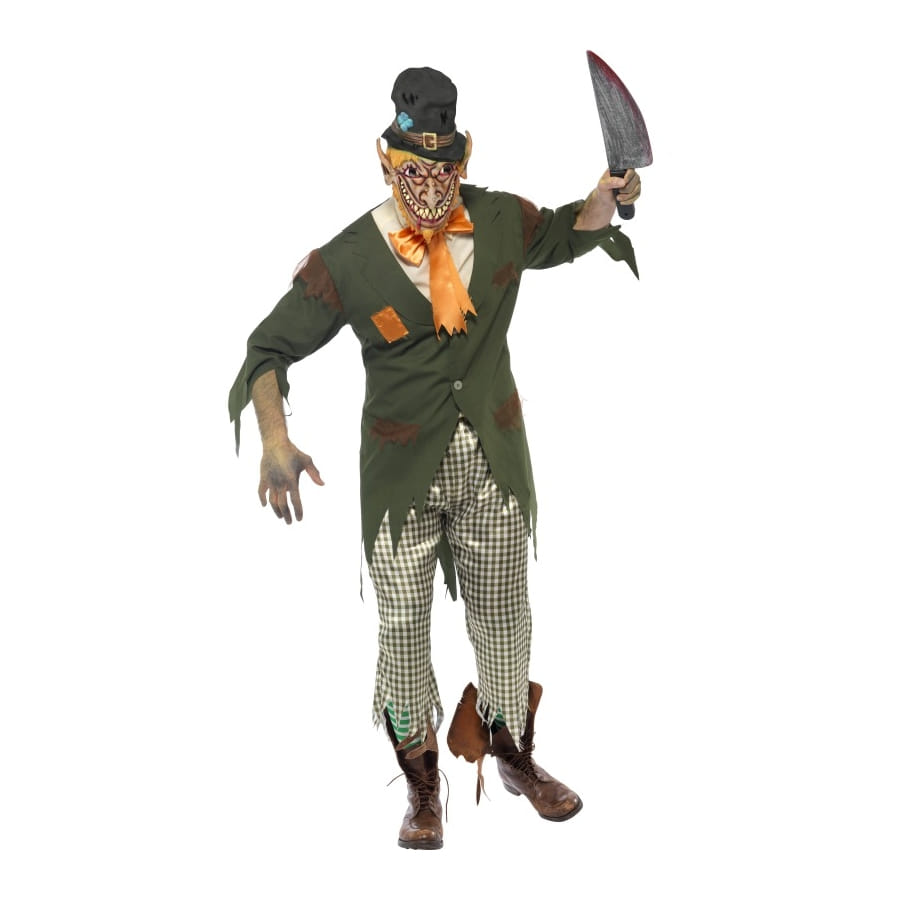 Déguisement de Leprechaun malchanceux, pour homme, composé d'une veste verte, d'un noeud papillon orange, d'un pantalon à carreaux et d'un masque de lutin malchanceux et malveillant. Choisissez entre une taille S, M ou L au moment de votre commande. Personne n'osera s'approcher de vous une fois que vous aurez enfilé ce déguisement.