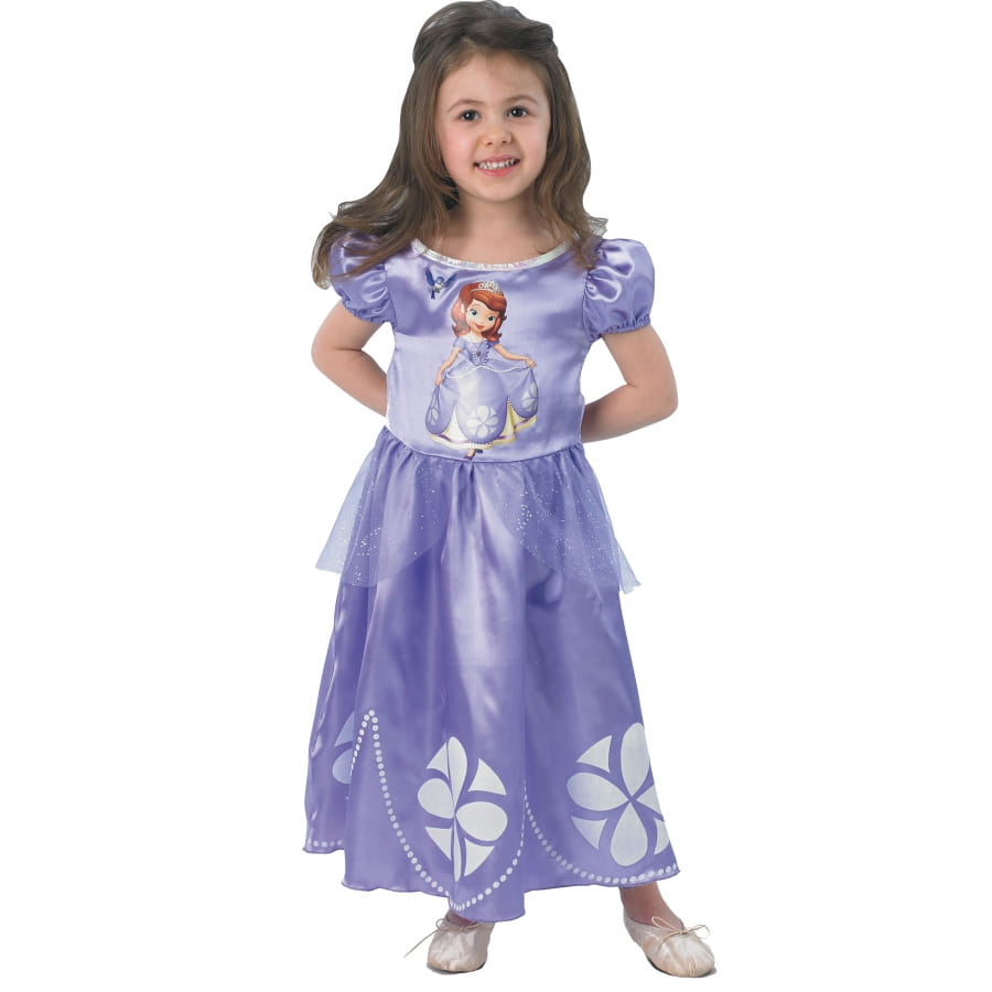 Ah les magnifiques contes de princesse ! Votre petite fille doit sûrement rêver de l'histoire de la belle princesse Sofia, une fille ordinaire qui est devenue princesse du jour au lendemain. Mais pourquoi ne pas réaliser son rêve ? Vous pouvez lui offrir ce beau déguisement sous licence princesse Sofia, composé d'une longue robe de couleur violette, avec des petits volants autour de la taille ainsi que quelques motifs de couleur blanche ; mais surtout la photo de la vraie princesse Sofia sur le devant, qui porte exactement la même robe. Votre fille se dira Waouuuhh, quelle belle robe de princesse et elle sera toute fière de la porter! Vous pouvez aussi lui donner la même coiffure que Sofia, avec des chaussures blanches, et elle sera la plus mignonne de toutes les princesses.