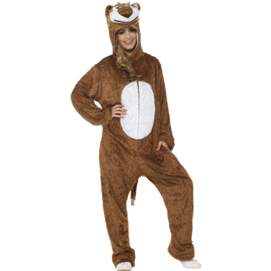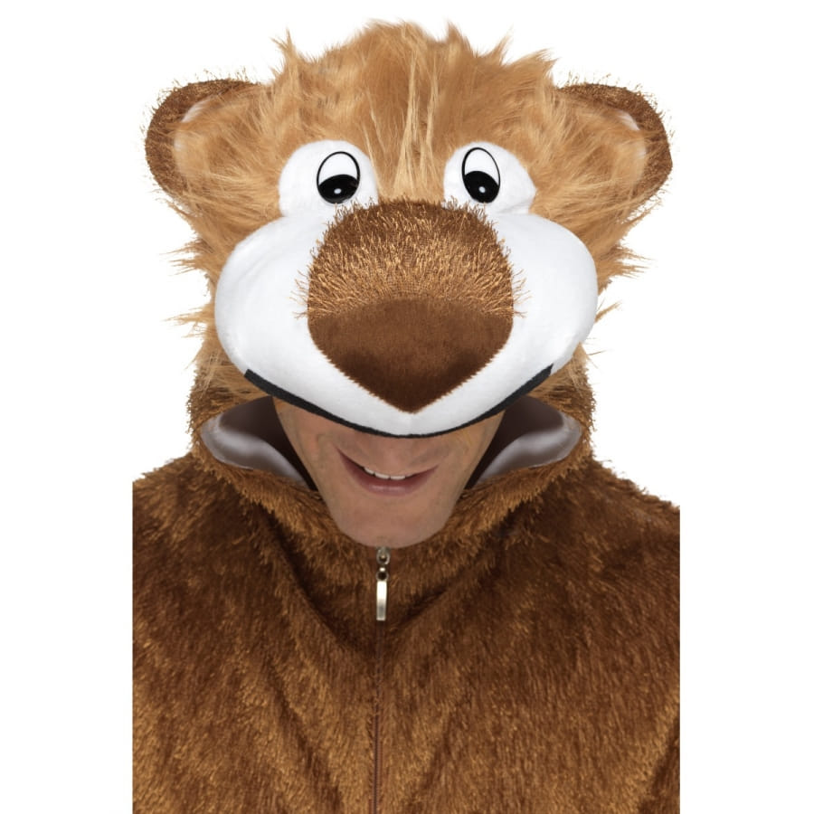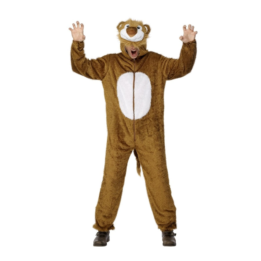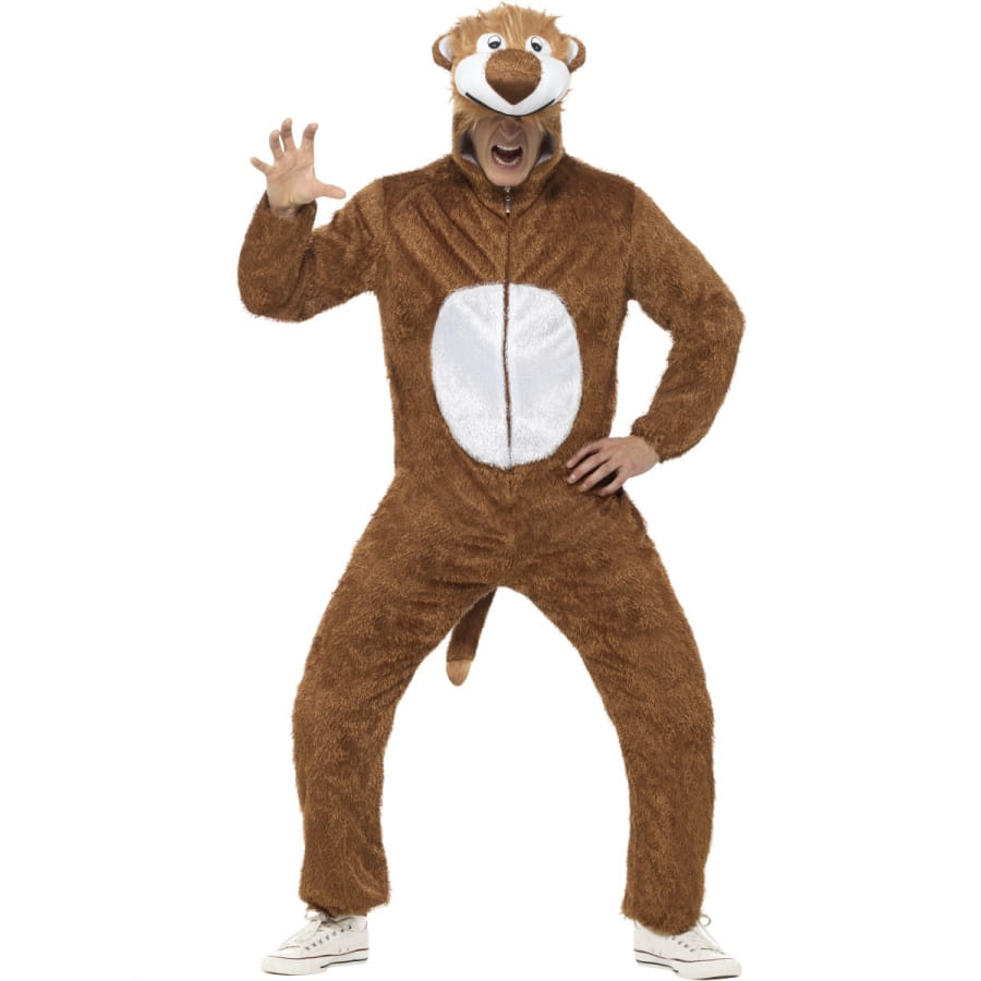 Déguisement de lion, pour homme, composé d'une combinason et d'un capuchon en forme de tête de lion, de couleur marron et blanche. Cet ensemble tout doux donnera à vos amis l'envie de vous cajoler.