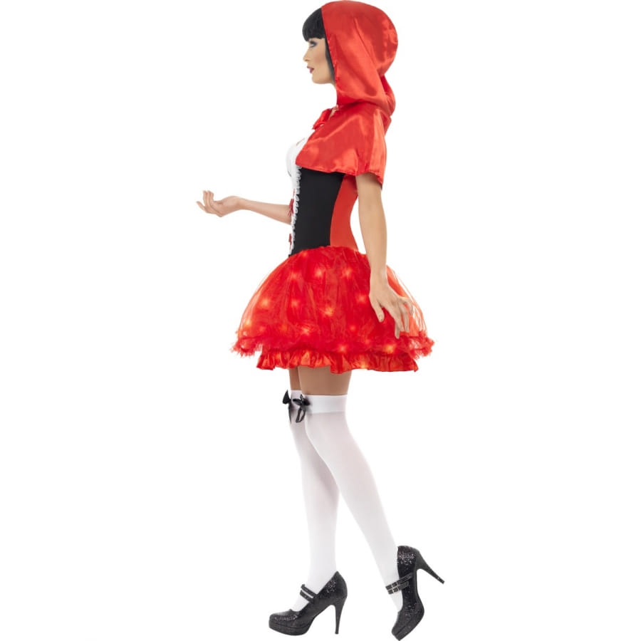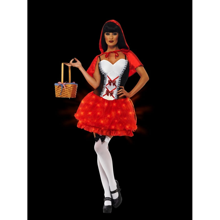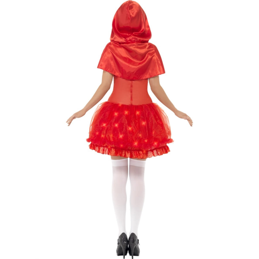 Déguisement de Petit Chaperon Rouge, pour femme, composé d'une robe noire, rouge et blanche lumineuse et d'une cape rouge. Ces deux accessoires sont disponibles en taille S, M ou L. Cette tenue sera idéale pour une collecte de bonbons lors de la nuit d'Halloween.