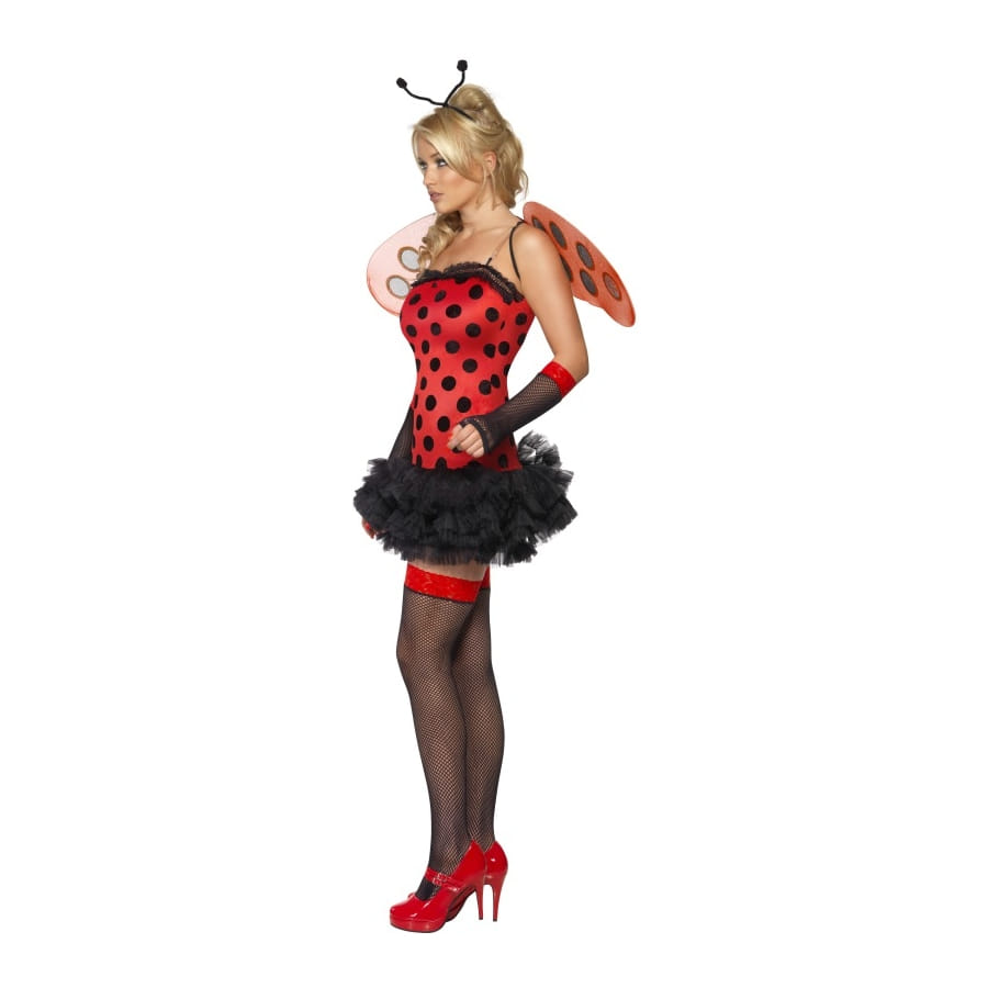 Déguisement de Madame Coccinelle, pour femme ou adolescente, composé d'une robe avec corset rouge à pois noirs avec tutu noir, d'une paire d'ailes assorties et d'antennes noires. Ce déguisement sexy sera parfait pour un enterrement de vie de garçon ou de jeune fille.