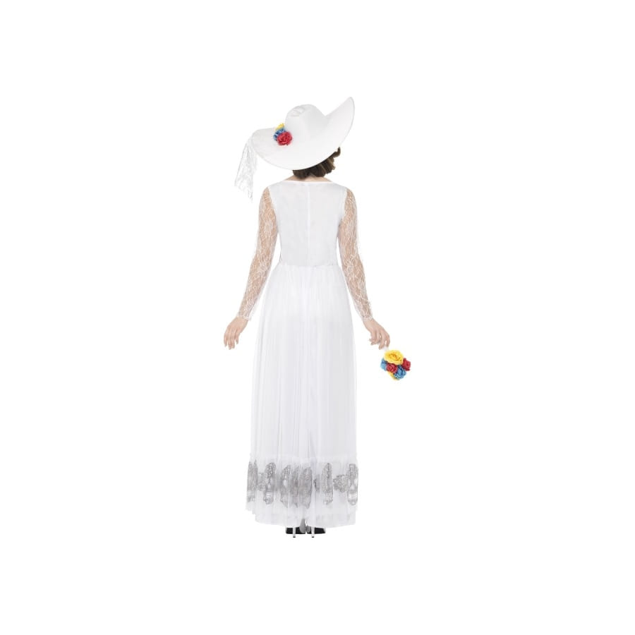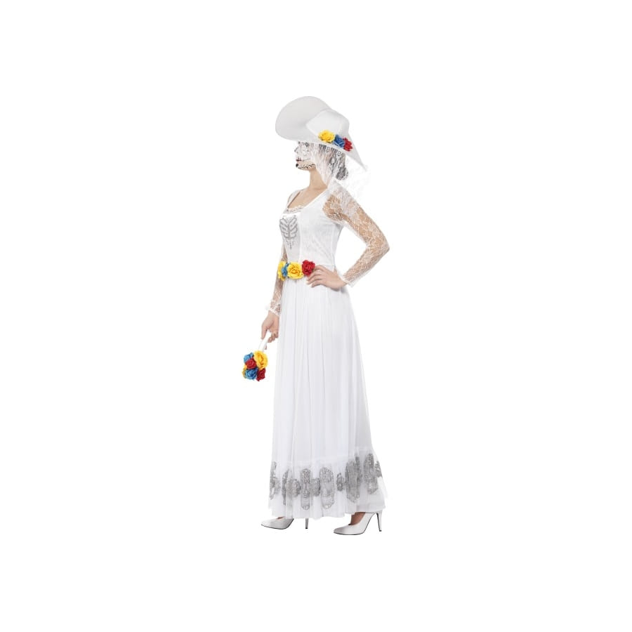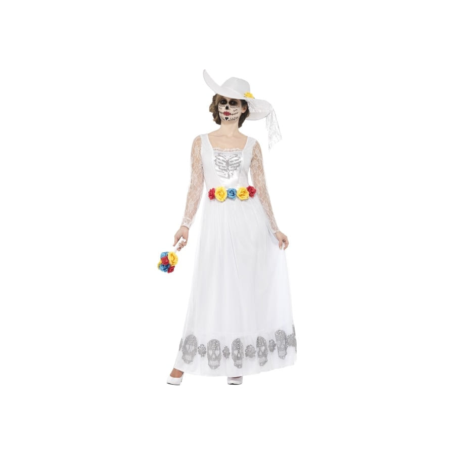 A Halloween, tout le monde aime bien porter des vêtements sombres. Pour changer, que diriez-vous d'adopter une idée originale : devenir la mariée d'Halloween. Le déguisement madame squelette jour des morts a été confectionné rien que pour vous mesdames ! Il est constitué par une ravissante robe blanche, avec de longues manches en dentelle. La partie inférieure est ornée de motifs têtes de morts mexicains. Quelques roses artificielles ont été disposées au niveau de la taille pour apporter un peu de couleur. Elles sont de la même couleur que les roses qui composent le bouquet de fleurs artificielles. Un large chapeau de couleur blanche décoré de quelques roses également complète ce magnifique déguisement de mariée d'Halloween.