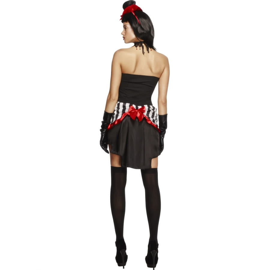 Déguisement de Madame Vampire de couleur rouge, blanche et noire, pour femme, composé d'une jupe, d'un top et d'un chapeau. La jupe et le top sont tous deux à rayures blanches et noires, avec noeuds et volants rouges. Le chapeau est en forme de mini haut de forme. L'ensemble a une allure très burlesque et gothique à la fois.