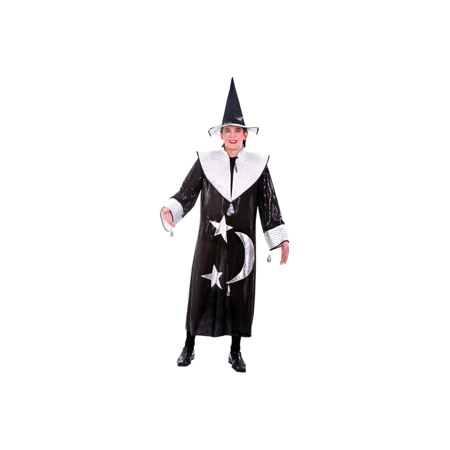 Le monde fantastique de la magie ne cessera de nous émerveiller de par ses sortilèges. Ce déguisement de magicien intergalactique pour homme de taille 50 et 54 arbore les couleurs noires, blanches et argentées. Composé du manteau, d'un col épais et d'un grand chapeau pointu. Qui sait, Merlin aura peut-être trouvé son successeur.