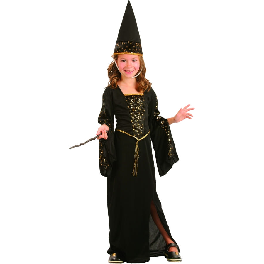 Déguisement de magicienne, pour fille âgée de 7 à 9 ans, composé d'une robe et d'un chapeau. Ces deux accessoires sont entièrement noirs, avec de petits motifs dorés en forme de lune et d'étoile. Vous pourrez déguiser votre enfant pour Halloween ou une fête d'anniversaire, en gentille magicienne.