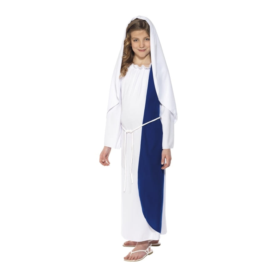 Déguisement de Marie, pour enfant, composé d'une robe blanche et bleue et d'un voile blanc. Au moment de passer la commande, vous pourrez choisir entre une taille S, M ou L. Votre enfant sera la personnification de la pureté avec ce déguisement.