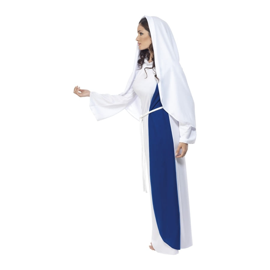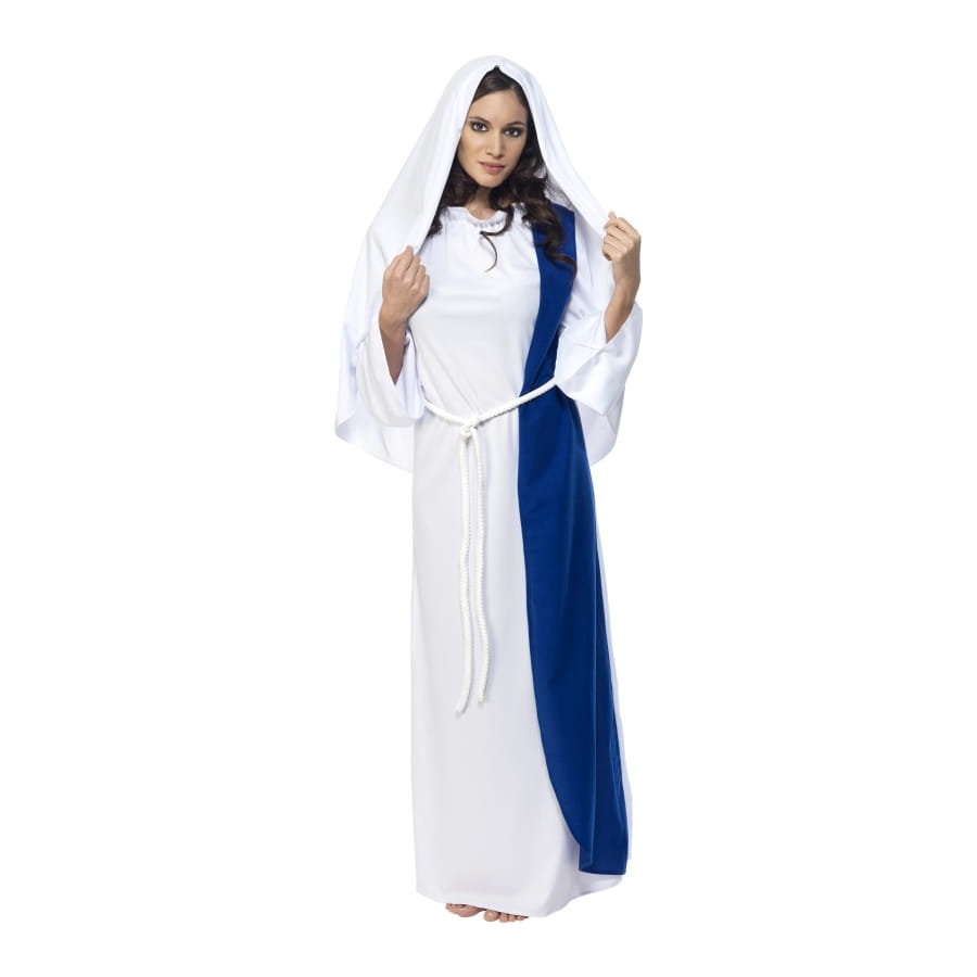 Déguisement de Marie, pour femme, composé d'une robe blanche et bleue ainsi que d'un voile blanc. Cet ensemble est parfait pour une fête religieuse où vous souhaitez incarner la mère de Jésus.