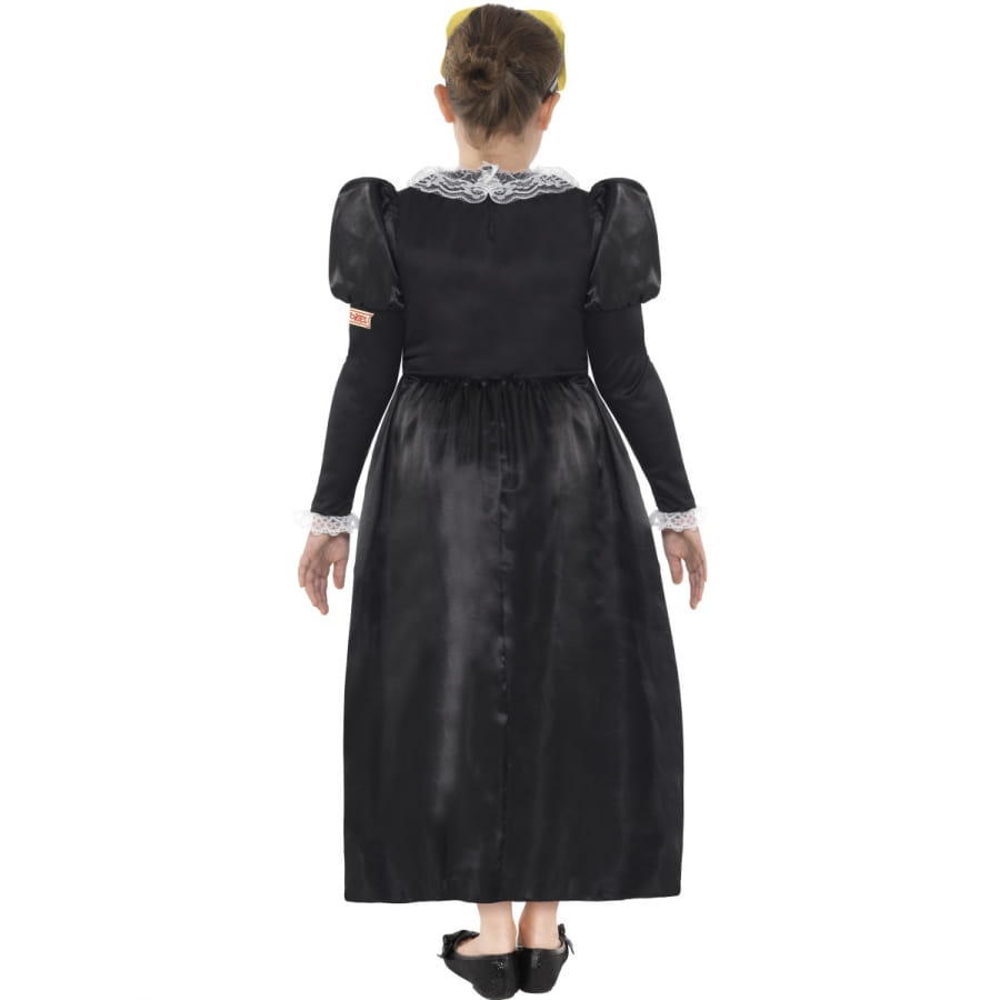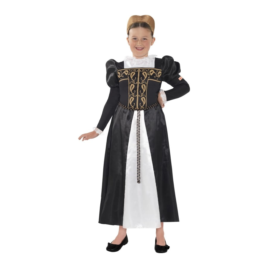 Marie Stuart, la reine des Ecossais comme on l'appelait, était une reine aimée et respectée de son temps. Tous les ouvrages et films relatant son histoire tragique ont eu du succès. Pour les petites filles qui rêvent de devenir reine un jour, il faut qu'elles connaissent son histoire. Et c'est pour qu'elles s'intéressent beaucoup plus à cette reine, que nous avons conçu ce déguisement, fait avec une robe noire ornée de blanc et doré, de longues manches un peu bouffantes au niveau des épaules et un bandeau de couleur or et bronze. Cette tenue pourra faire croire aux autres enfants que votre petite fille est une vraie reine à la maison. Disponibles pour les enfants de 7 à 9 ans (taille M) et de 10 à 12 ans (Taille L), ce costume se lave en nettoyage à sec uniquement.