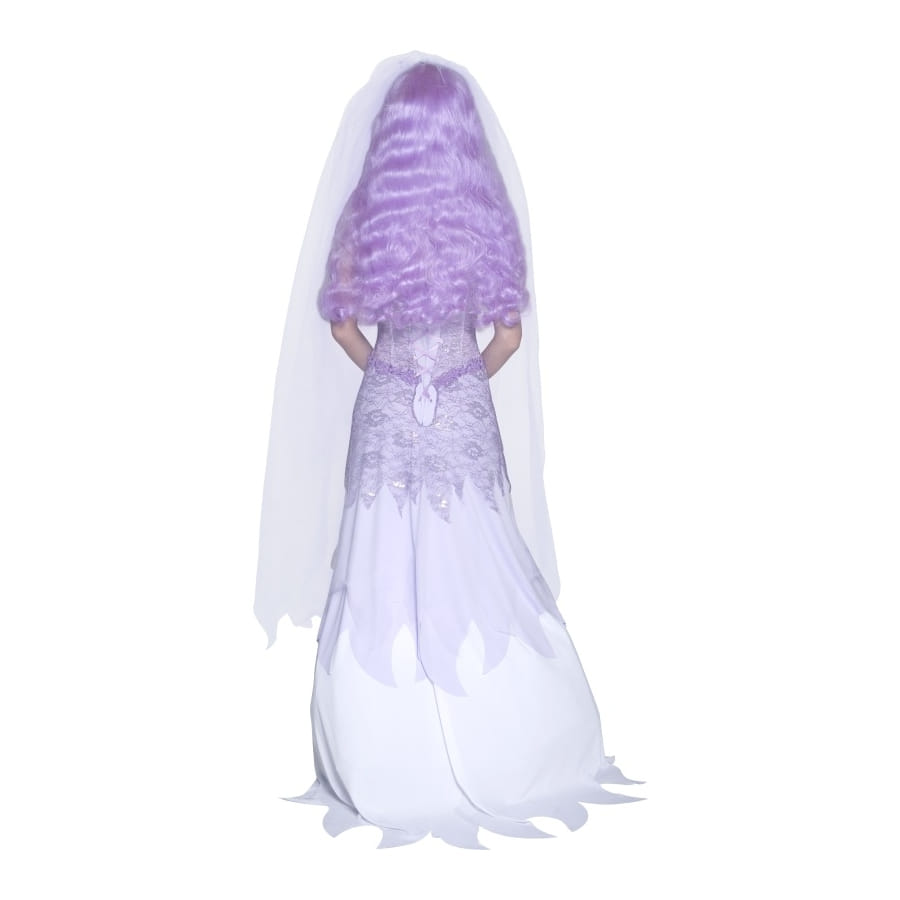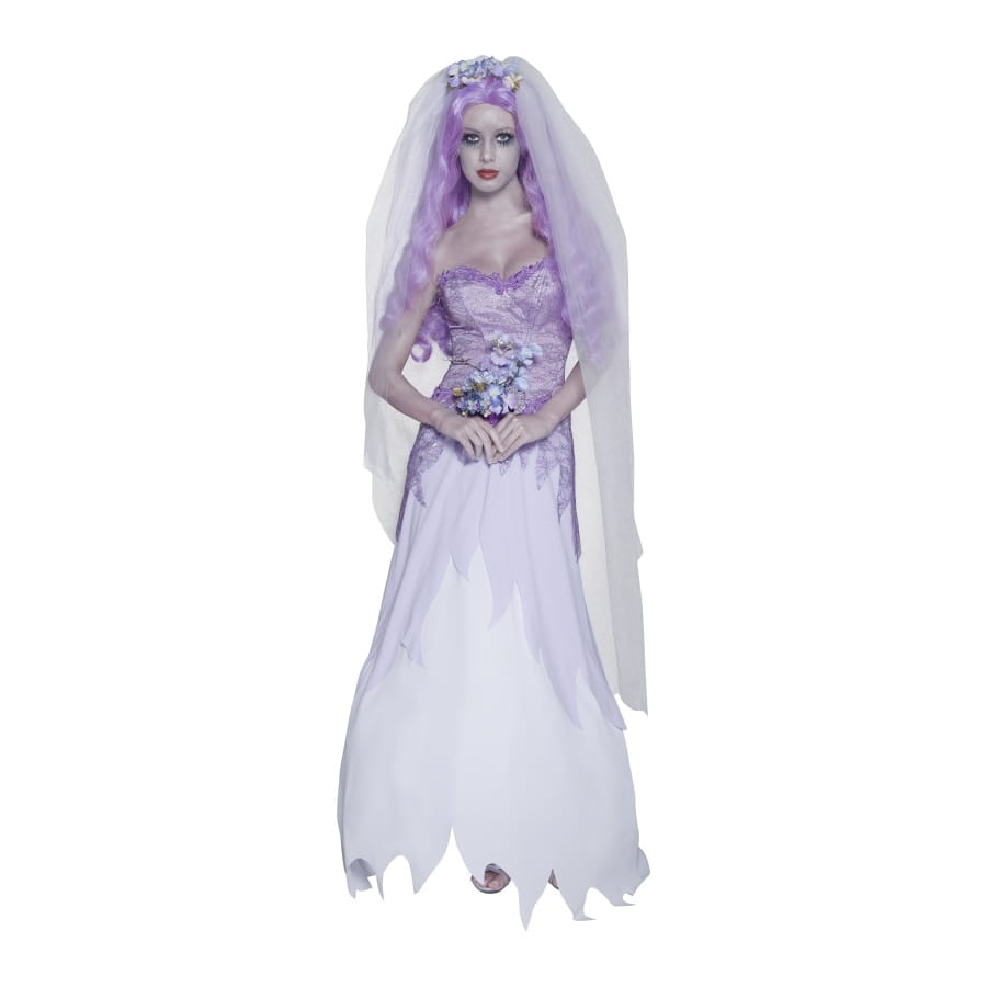Déguisement de mariée fantôme gothique, pour femme adulte, composé d'une jupe blanche, d'un corset violet, d'un voile et d'un bouquet assortis. Tous les accessoires sont très pâles, pour accentuer le côté mort de votre déguisement. Ce dernier est disponible en taille S, M ou L. Bien qu'effrayant, cet ensemble fera de vous une très jolie mariée quand même.