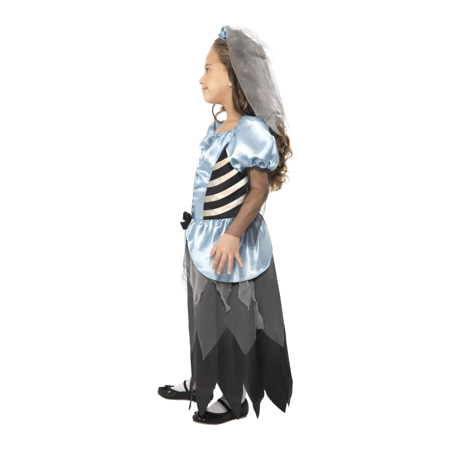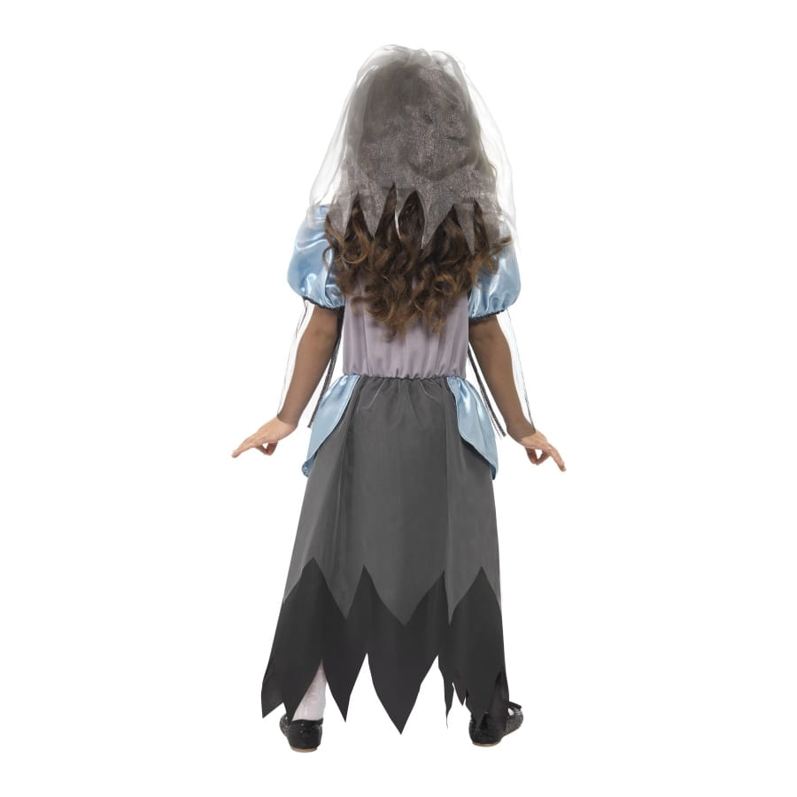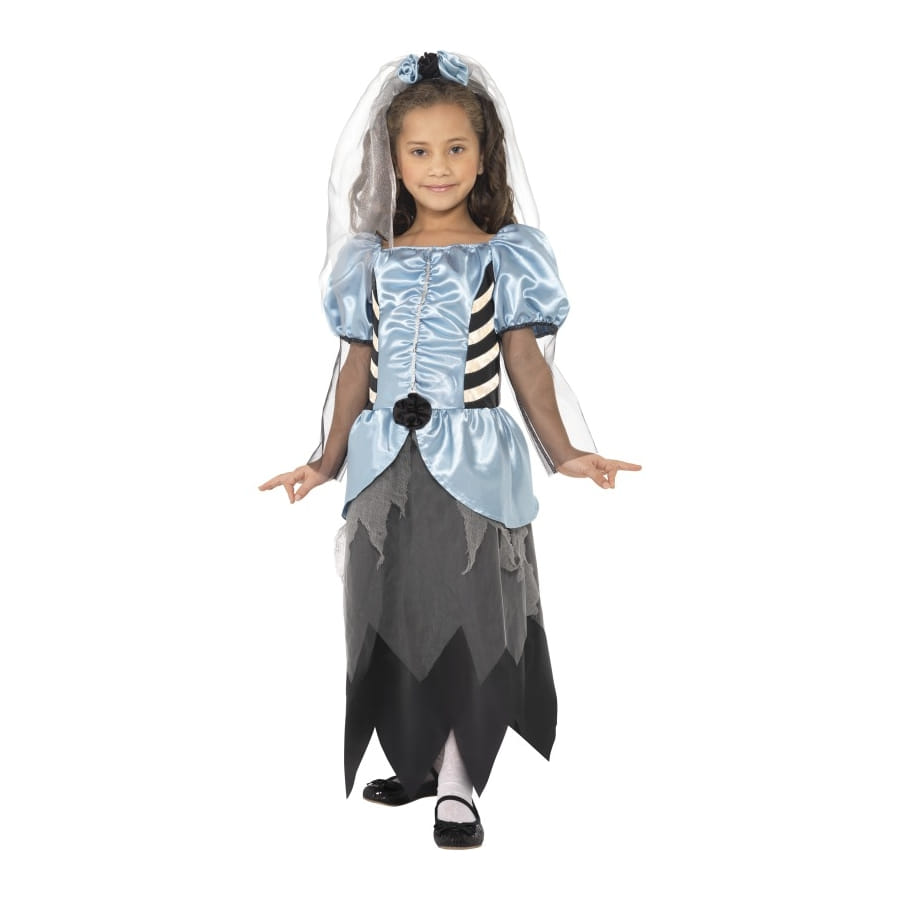 Déguisement de mariée gothique, pour fille, composé d'une robe blanche, bleue et noire et d'un voile transparent bleu. Ce joli ensemble donnera à votre fille un air gothique et effrayant, idéal pour une fête d'Halloween réussie.