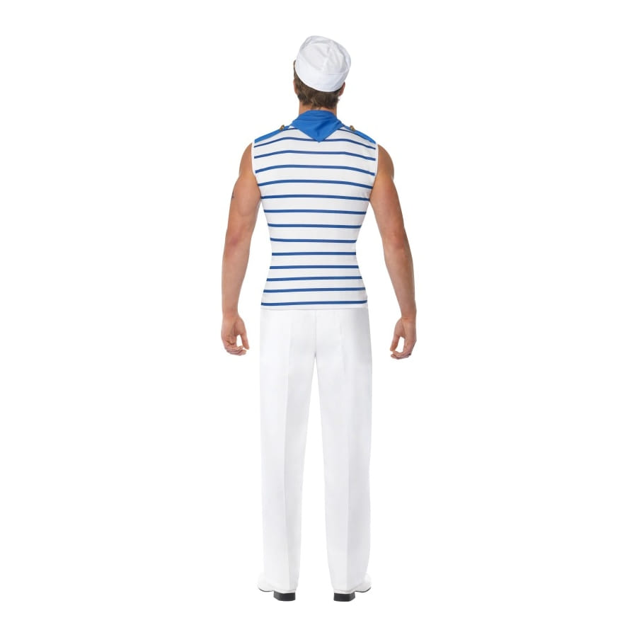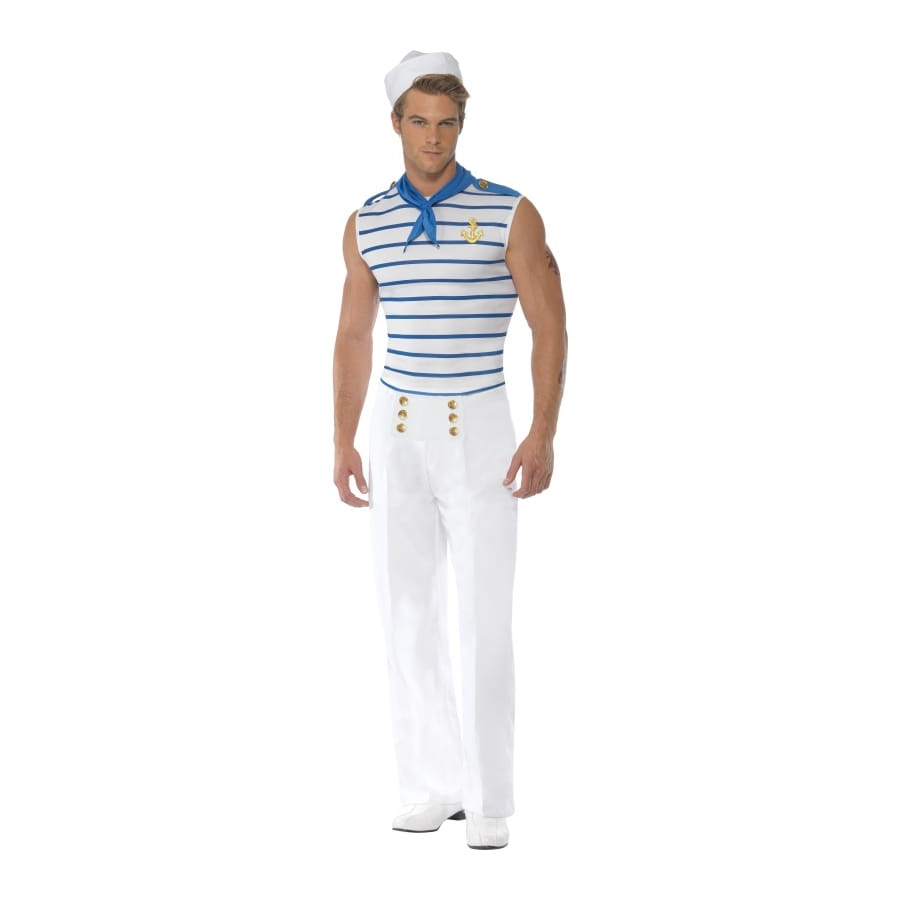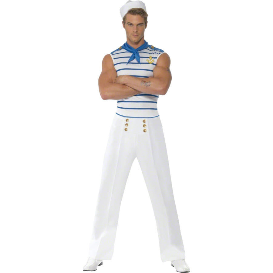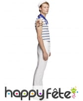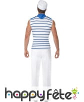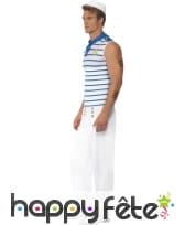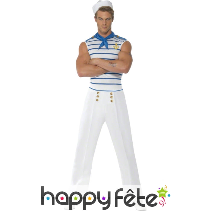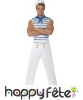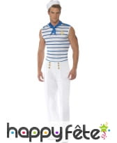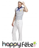 Déguisement de marin sexy, pour homme ou adolescent, composé d'un top blanc à rayures bleues, d'un pantalon blanc à boutons dorés et d'un foulard bleu. Cet ensemble est disponible en taille S, M ou L. Il est parfait pour un enterrement de vie de garçon ou de jeune fille.