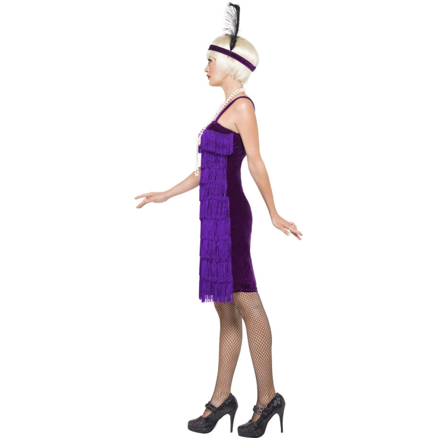 Déguisement jazz, pour femme, composé d'une robe et d'un chapeau. La robe est de couleur mauve, avec bretelles et franges assortie à la coiffe qui comporte également une plume noire. La robe est disponible en taille S, M, L, X1 ou X2. Elle vous donnera une apparence de jeune fille délurée des années Charleston.