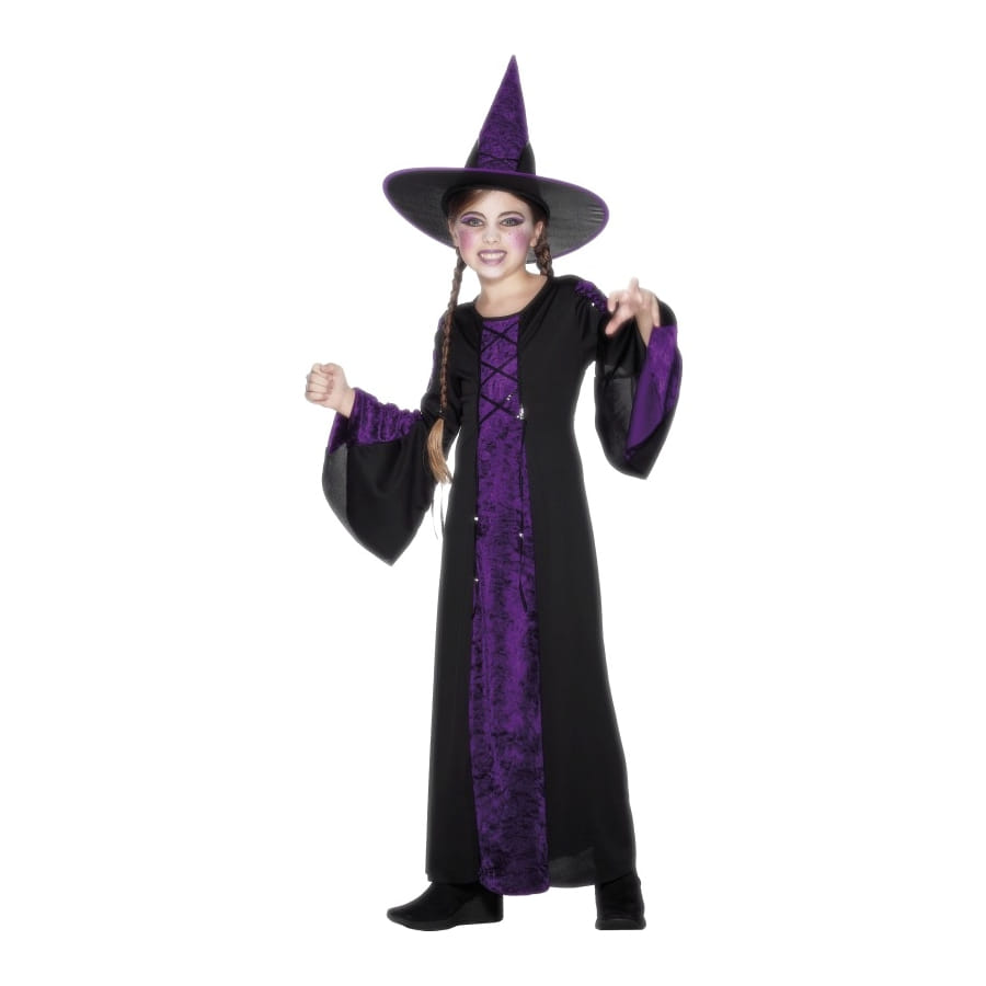 Un costume de sorcière pour votre fille lui ira très bien pour halloween. Elle pourra le porter pour le carnaval aussi ou a un gouter d'anniversaire. Ce costume est composé d'une robe manche longue de couleur noir et violet ainsi qu'un chapeau pointu.