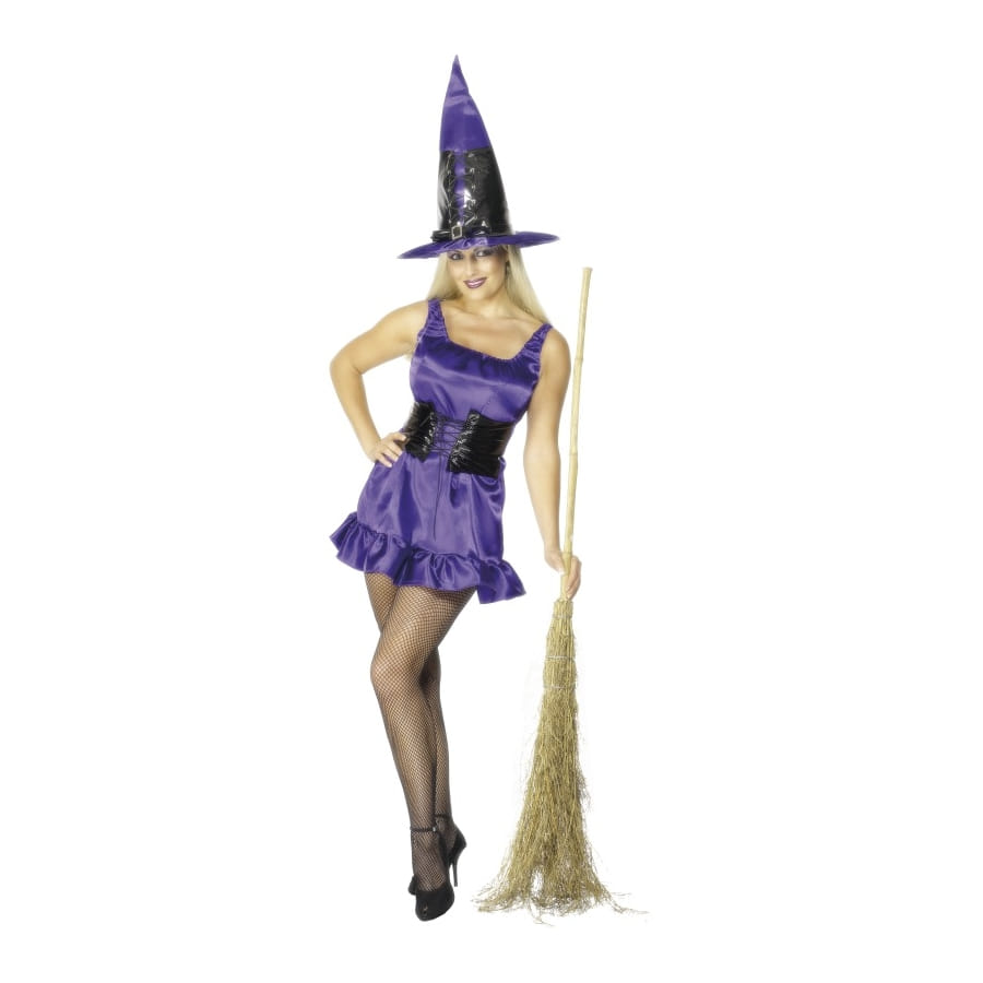 Ce costume de sorcière vous pourrez le porter pour halloween ou encore pour le carnaval. Ce déguisement est composé d'une robe sans manche, elle est courte. Il est aussi composé d'un chapeau pointu de couleur mauve et noir.