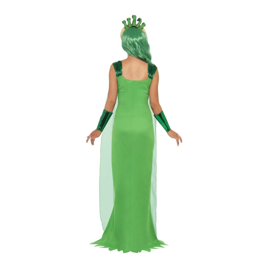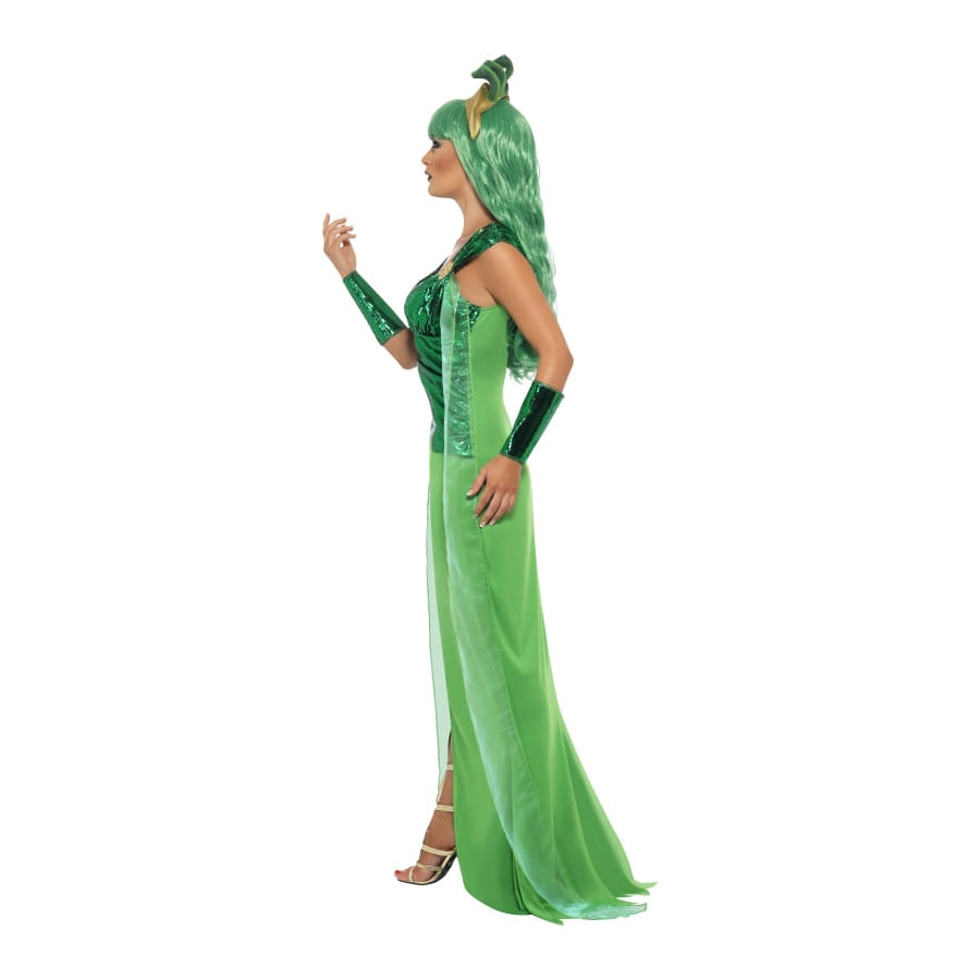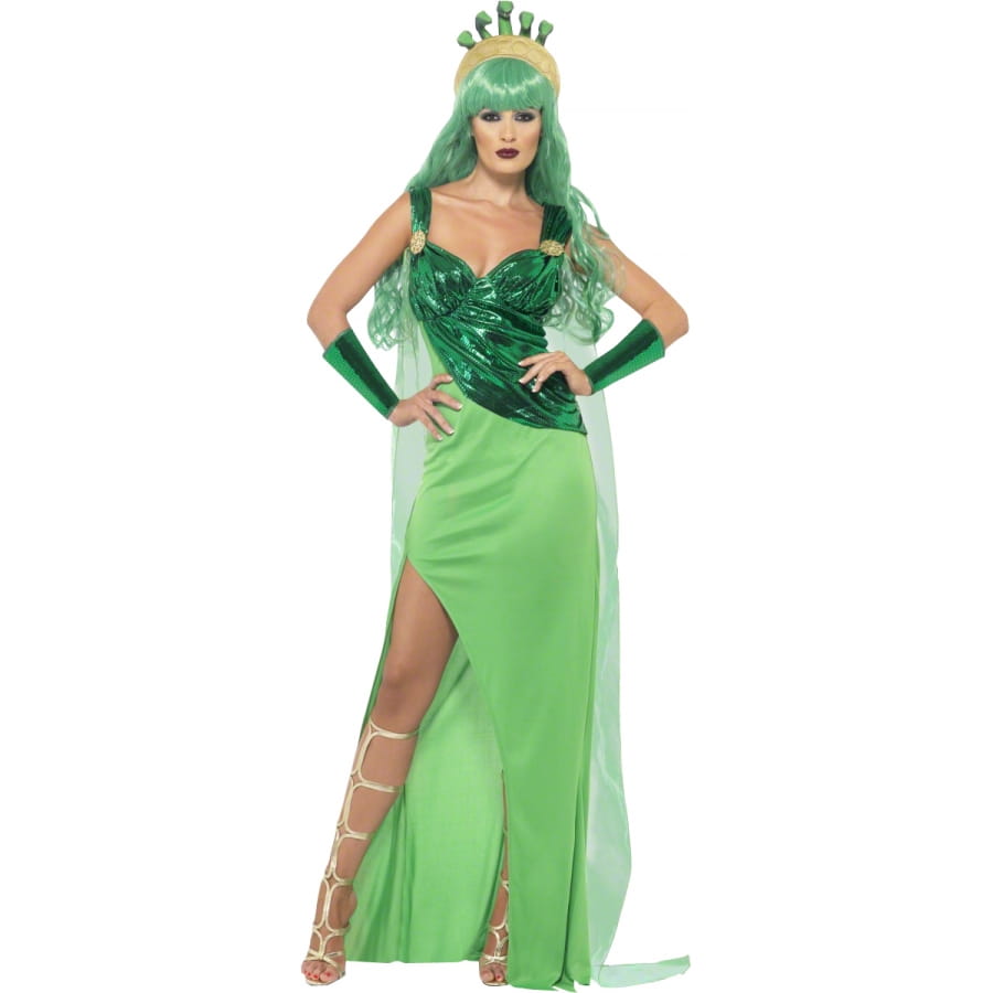 Déguisement de Médusa, pour femme, composé d'une longue robe vert fendue sur le côté, d'une coiffe et de gants assortis. Le haut de la robe est en satin et la coiffe est composée de serpents. Cet ensemble est disponible en taille S, M ou L. Procurez-vous une des perruques vertes proposées pour compléter votre déguisement et vous voilà transformée en personnage de la mythologie grecque.
