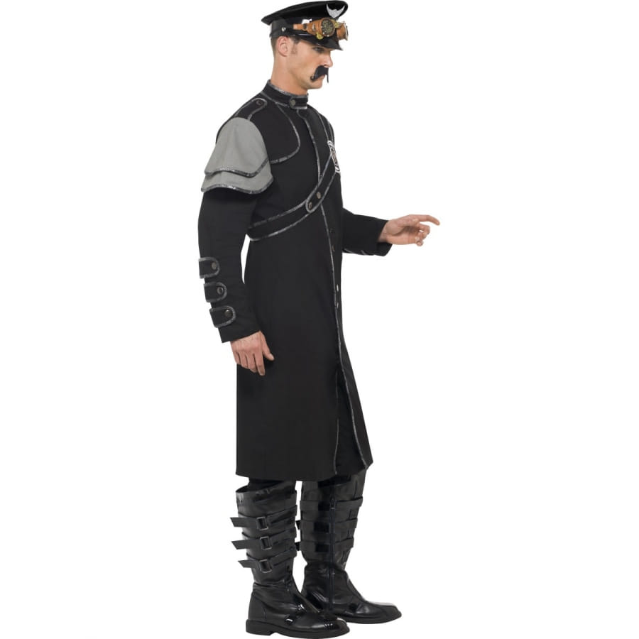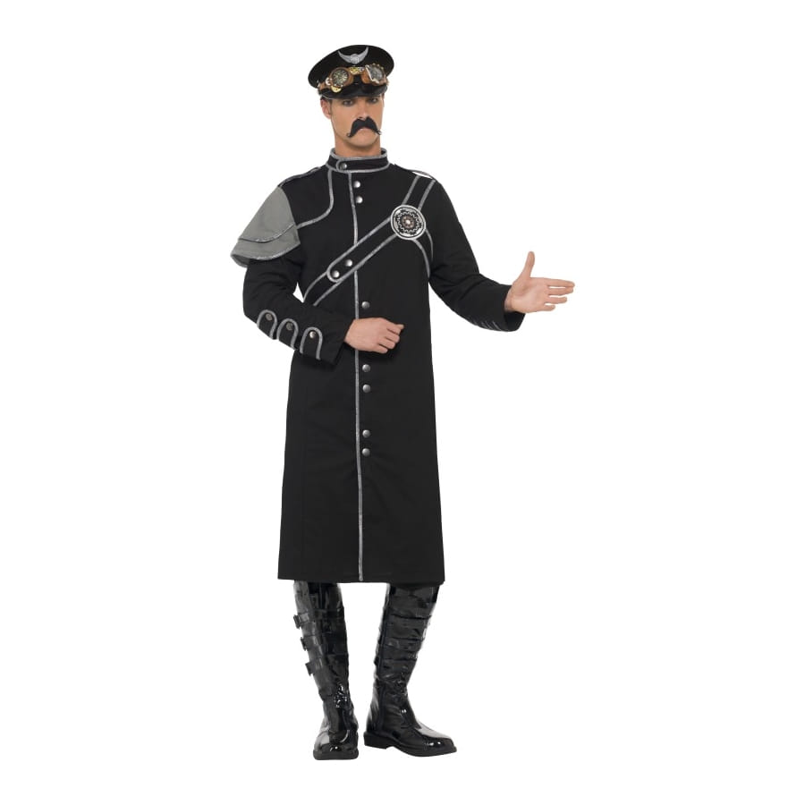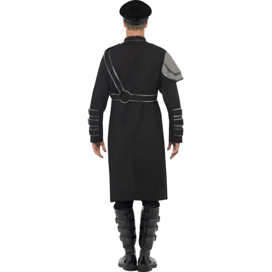 Déguisement militaire, pour homme, constitué d'une longue veste noire et grise. Elle arrive aux genoux, avec de longues manches et une épaulette grise. Elle est disponible en taille S, M ou L. C'est un déguisement mi-militaire et mi-punk, un style très prisé en ce moment parmi jeunes et plus âgés.