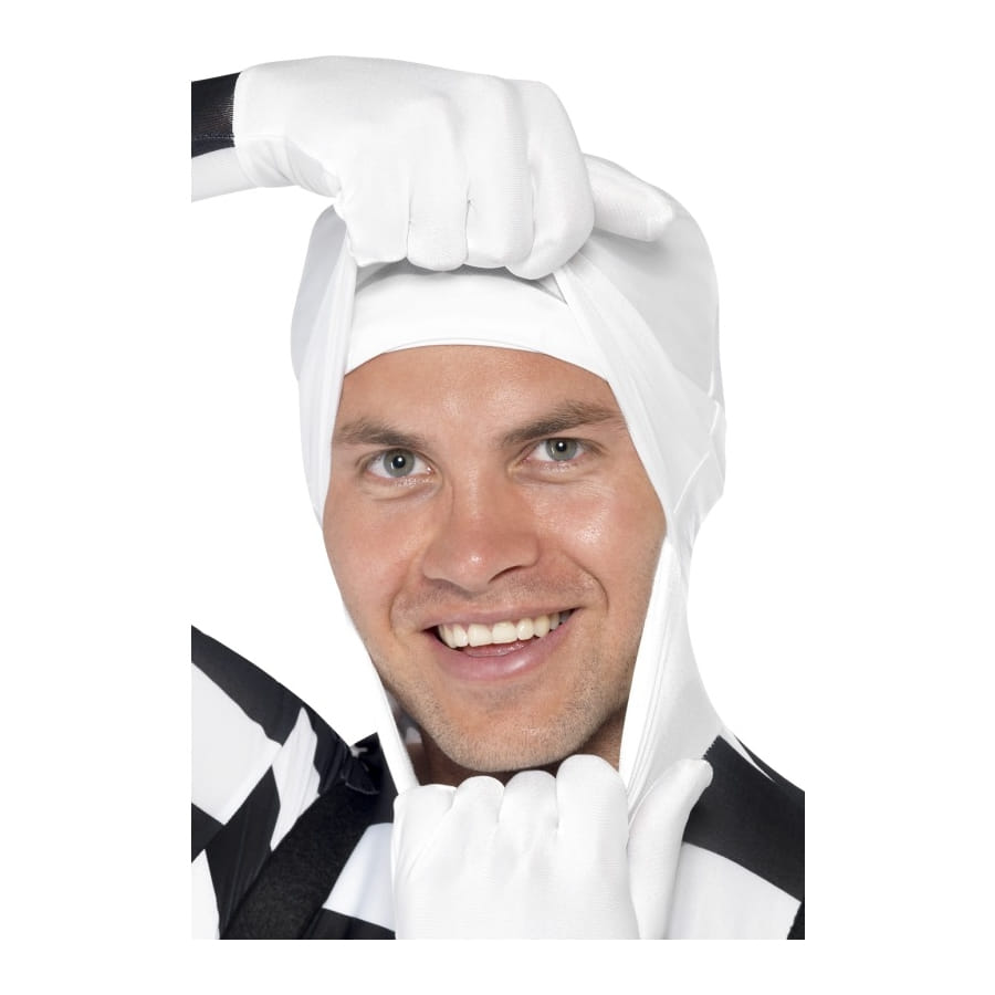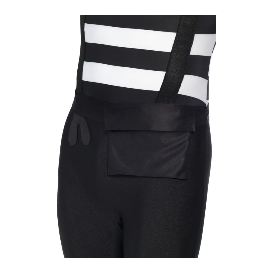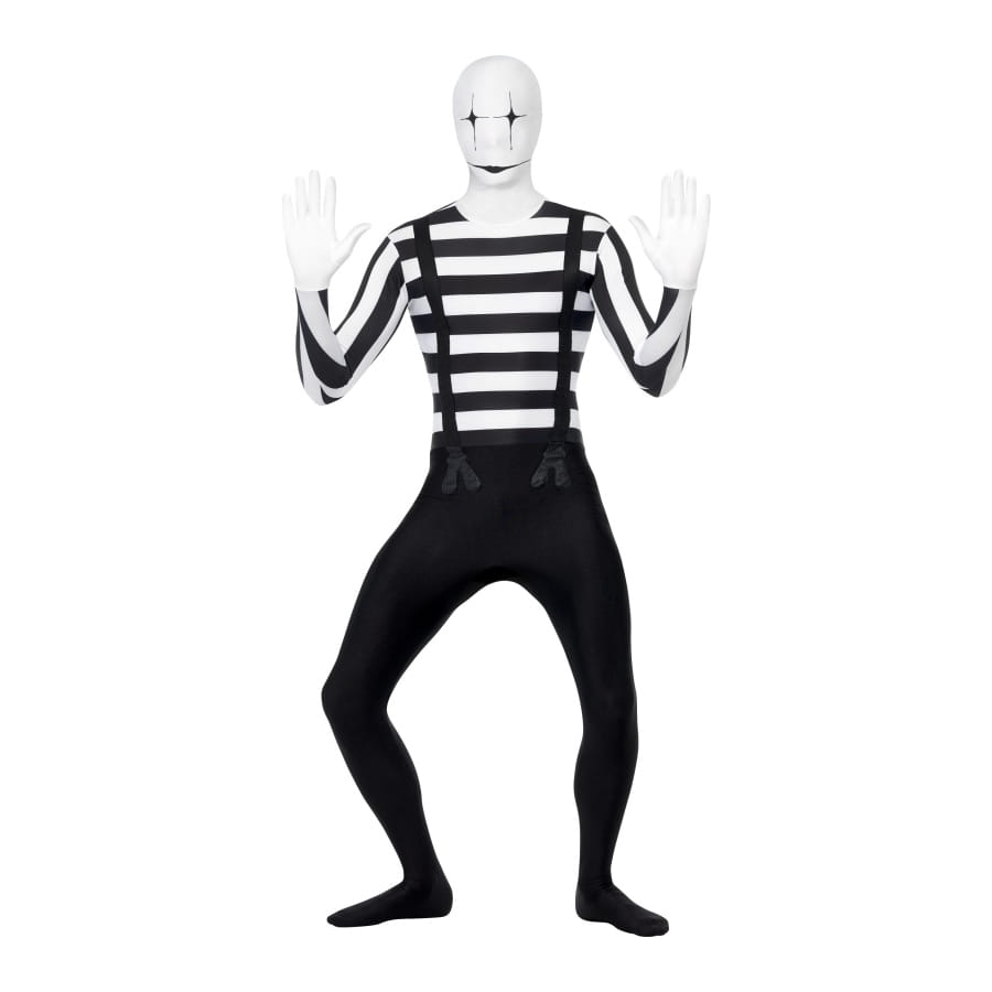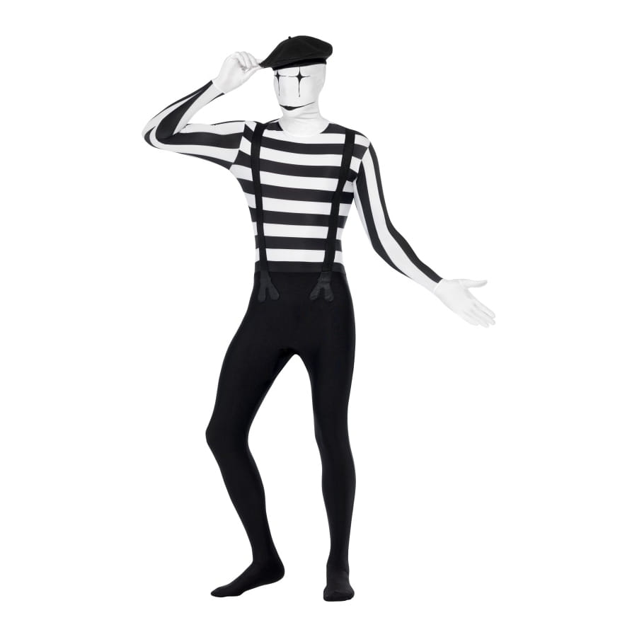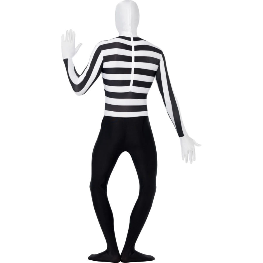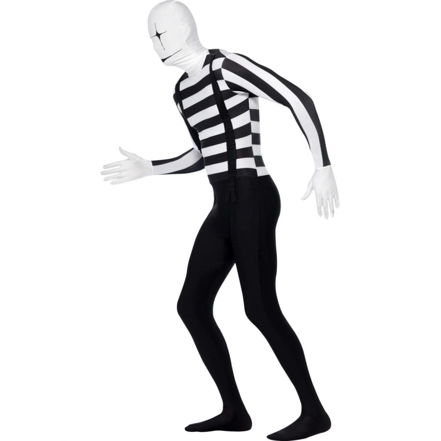 Ce costume seconde peau est une combinaison qui couvre le corps complètement. Ce costume mime seconde peau est de couleur noir et blanc. Tout le monde croira que vous portez un tshirt manche longue rayé noir et blanc, d'un pantalon noir et des bretelles noires.