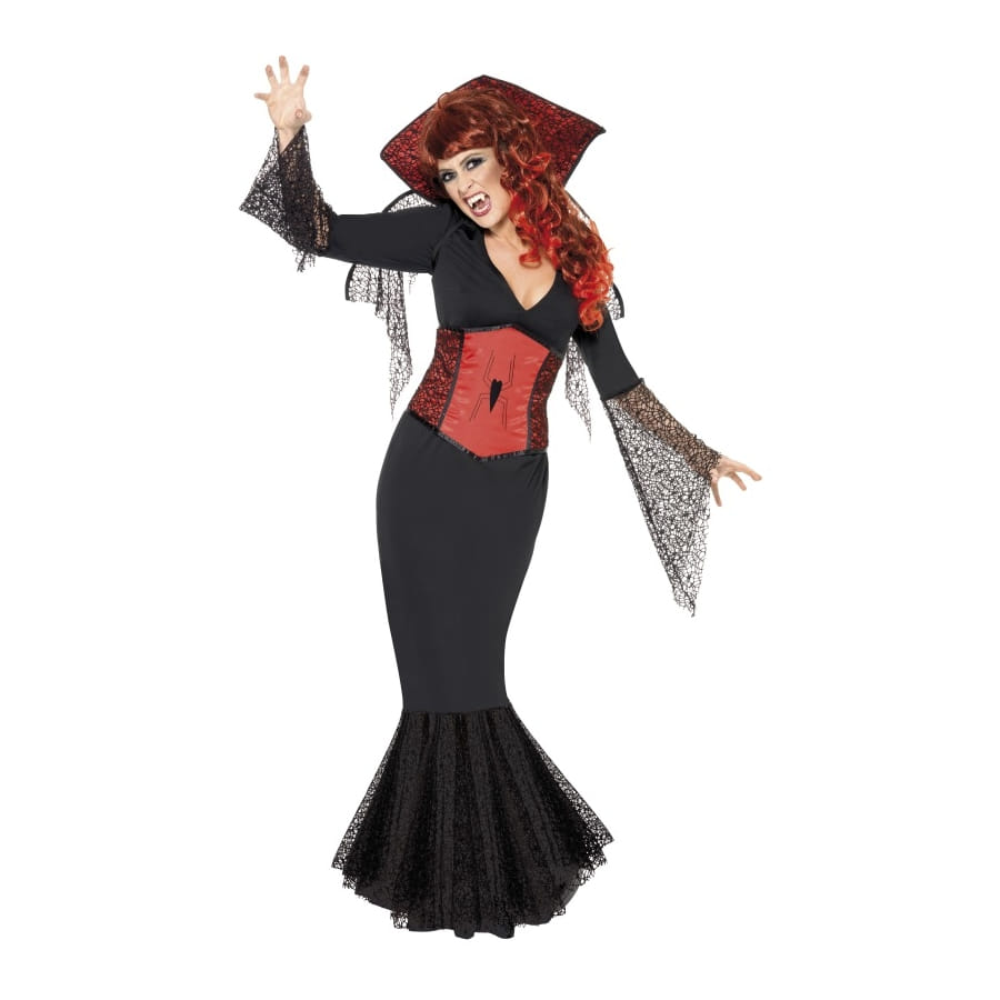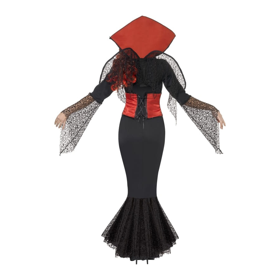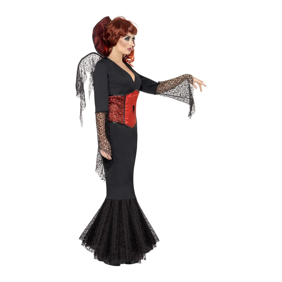 Déguisement de Miss Araignée, pour femme, composé d'une longue robe noire avec col rouge, d'un corset rouge et d'ailes noires. Les manches et le bas de la robe sont ornés de dentelles noires tout comme le corset qui est également imprimé d'une araignée noire. Ces accessoires sont disponibles en taille S, M ou L. Vous serez effrayant et attrayante à la fois avec cette tenue.