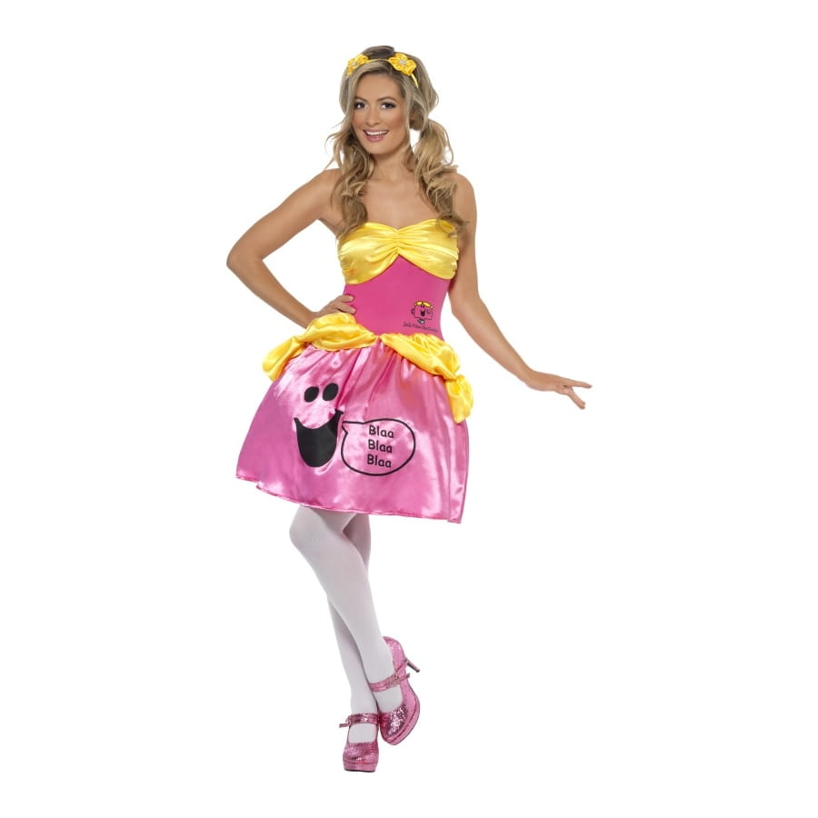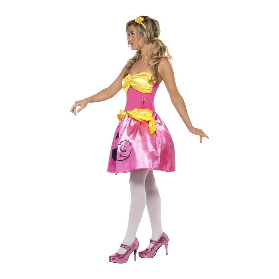 Déguisement de Miss Bavarde composé d'une robe jaune et rose en satin. Elle est disponible en taille S, M ou L et est imprimée d'un dessin "Miss Bavarde". Ce type de déguisement est approprié à un enterrement de vie de garçon.