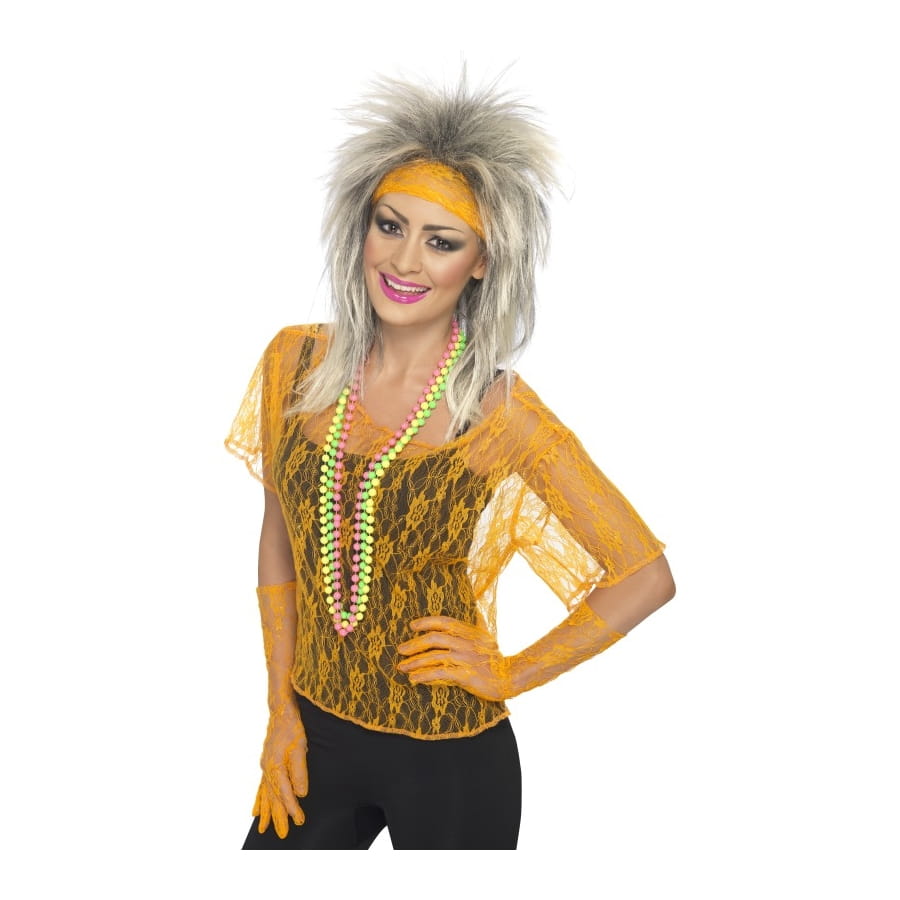Déguisement Miss Fluo, pour femme ou adolescente, composé d'une veste, d'une paire de gants et d'un bandeau, tous en dentelle de couleur orange fluo. Vous pourrez porter ces accessoires pour un déguisement de danseuse des années 70-80 ou pour un style punk.