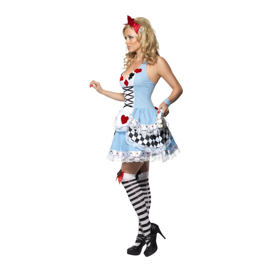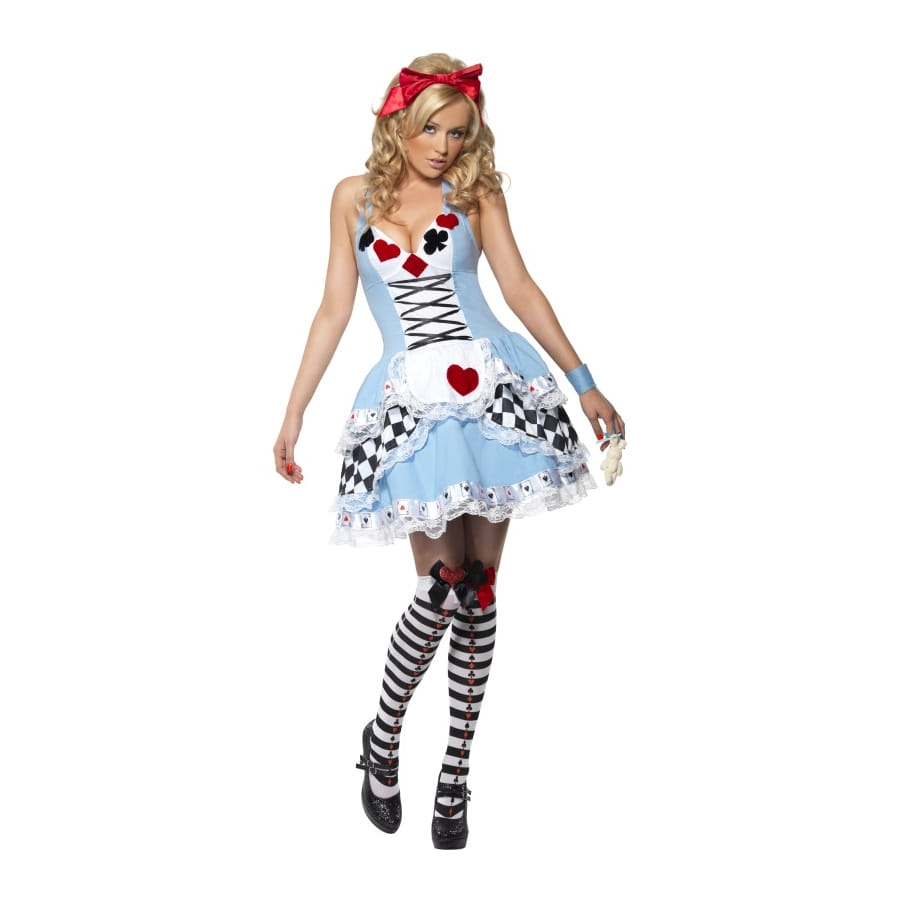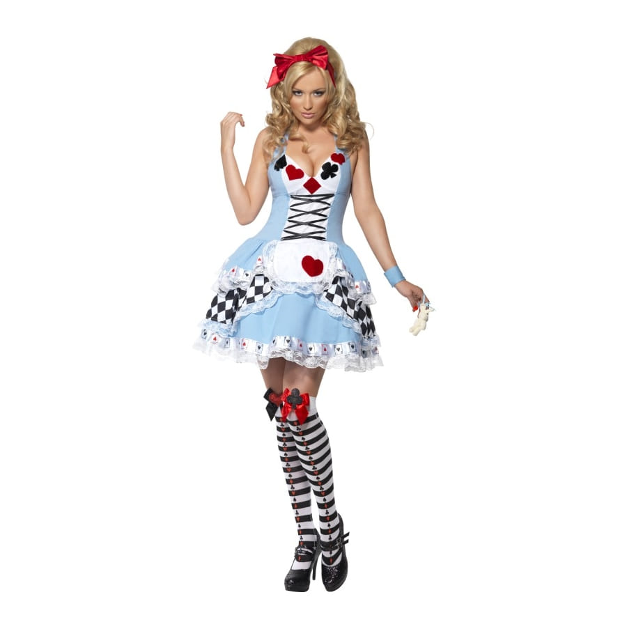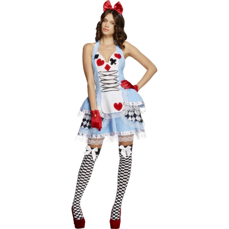 Déguisement "Fever" de Miss Pays Merveilleux, pour femme, composé d'une superbe robe et d'un serre-tête en forme de noeud rouge. La robe est de couleur bleu, blanche, rouge et noire, avec des motifs, des volants et des lacets. Elle sera disponible en taille S, M ou L au moment de la commande. Plongez tout le monde dans un univers merveilleux!