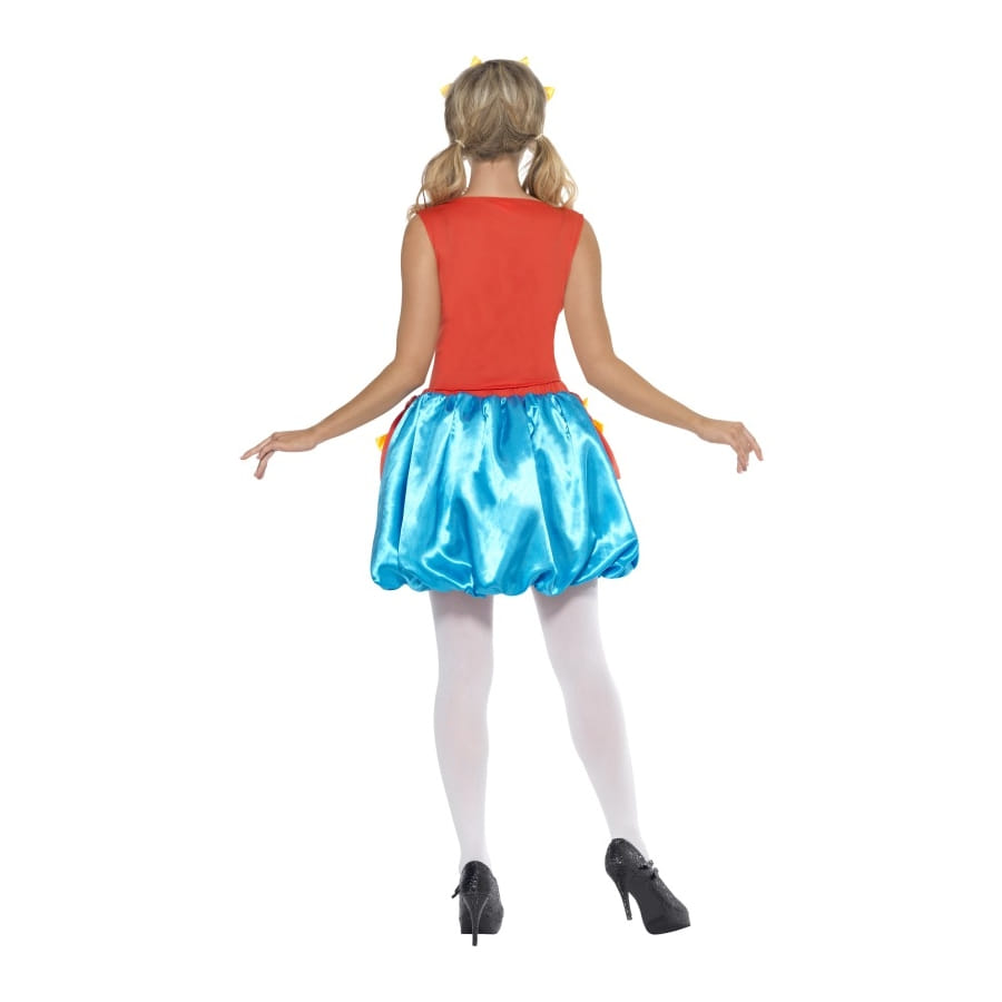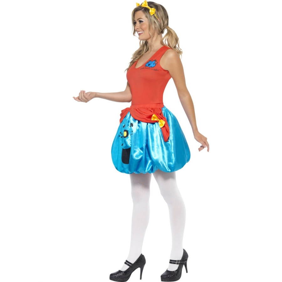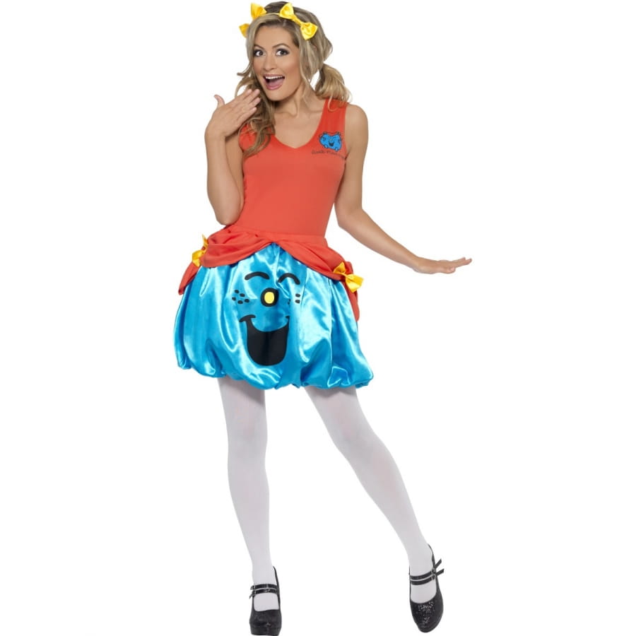Déguisement de Miss Sourire, pour femme, composé d'un top rouge, d'une jupe bleue et d'un serre-tête monté d'un noeud de couleur jaune. La jupe est décorée de motifs et d'autres imprimés. Apportez le sourire à vos invités ou camarades en vous incarnant en personnage souriant.