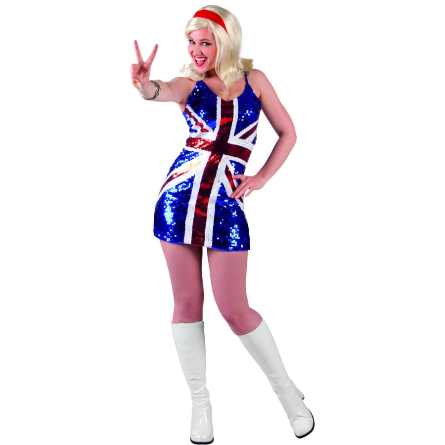 Déguisement de Miss UK, pour femme, constitué d'une mini-robe paillettée. La robe est imprimée tel le drapeau britannique, de couleur rouge, blanche et bleue. Ses paillettes la rendent encore plus attrayante, faisant d'elle la robe idéale pour une soirée célébrité ou en honneur de la Grande Bretagne.