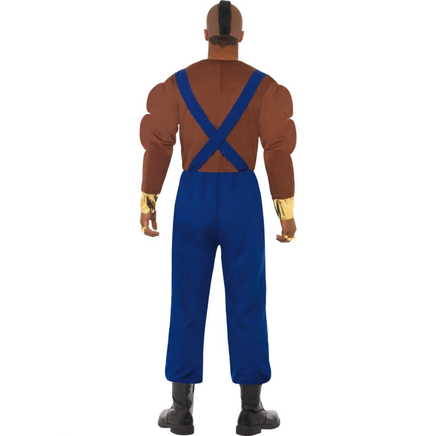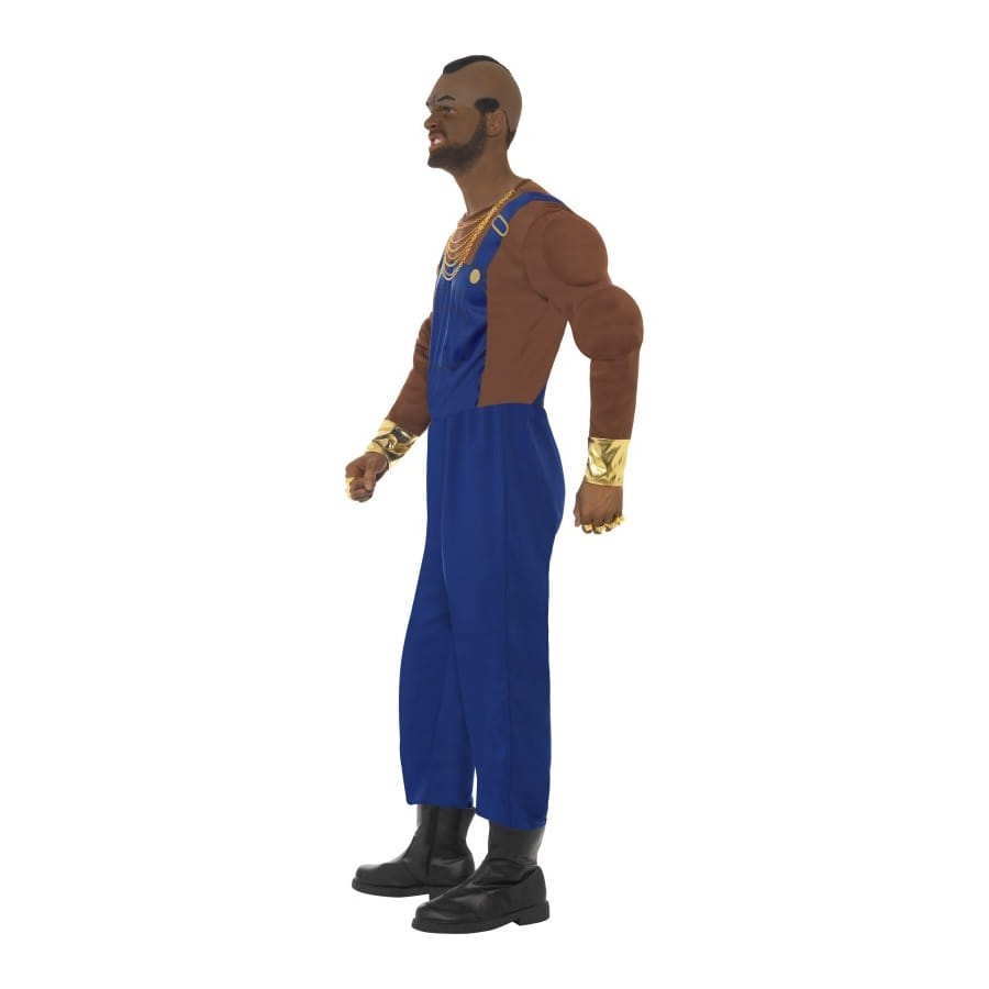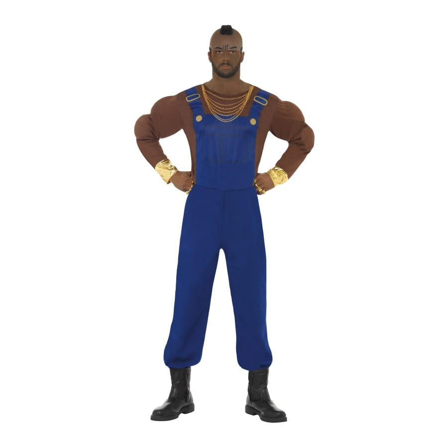 Pour une soirée sur le thème muscle ou encore célébrité pourquoi ne pas porter le déguisement de monsieur T. Ce déguisement est composé d'un top rembourré de couleur marron avec l’extrémité de couleur jaune, d'une salopette, bleu, de chaine et aussi d'une tête en latex.