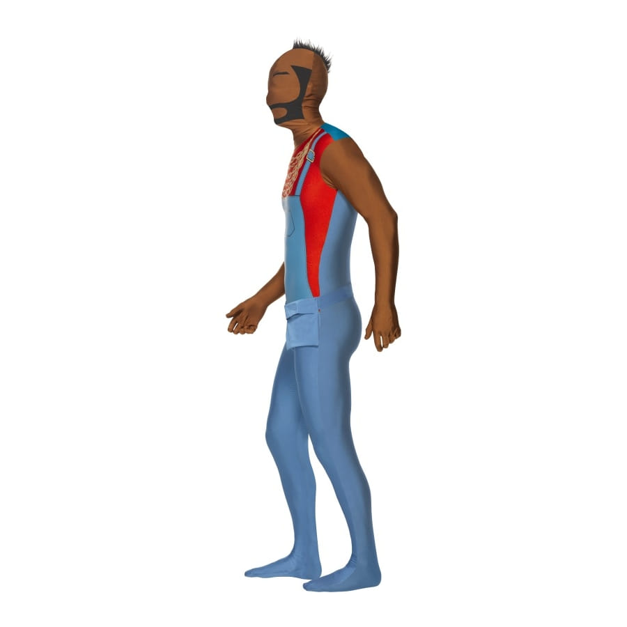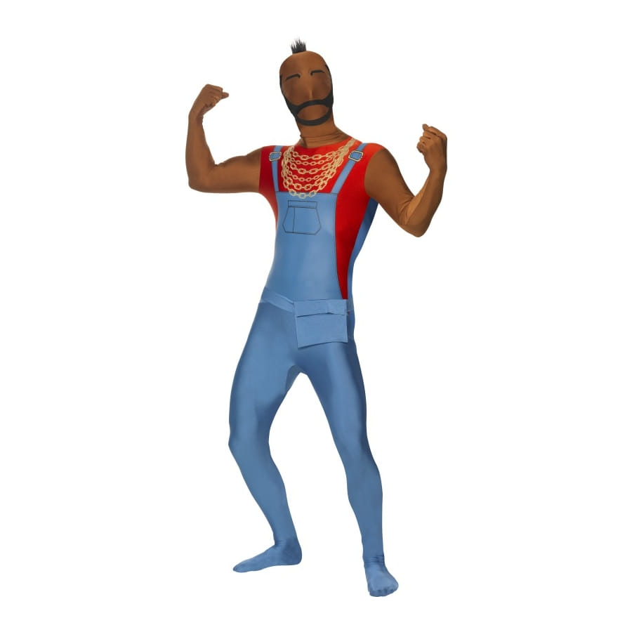 Ce déguisement monsieur T est une combinaison seconde peau. Il est de couleur bleu qui donne un effet salopette et un débardeur rouge , ainsi que de chaines dorées. Vous pourrez le porter pour le carnaval ou encore pour une fête déguisée sur le thème cinéma.