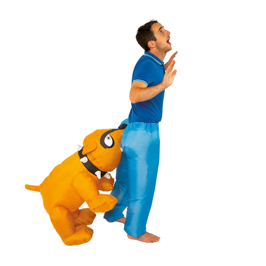 Rajoutez une pincée d'humour à votre costume lors d'un carnaval ou d'une fête à thème. Pour ce faire, misez sur une tenue originale et pratique à la fois. Si l'idée vous tente, nous avons l'article qu'il vous faut. En effet, nous vous proposons ce déguisement mordu par un bouledogue. Il reste disponible sur notre site. Prévu aussi bien pour les hommes que pour les femmes, ce costume se compose entièrement de PVC. Gonflable grâce à un système que vous alimenterez avec 4 piles AA non fournies, il allie confort et créativité ! Cet article se présente sous la forme d'un pantalon bleu à élastique. A celui-ci se trouve rattaché un grand bouledogue marron qui le mord.