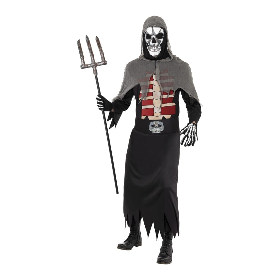 Déguisement de faucheuse squelette, pour homme, composé d'un haut noir, d'une jupe noire, d'une cape avec capuche grise, de gants imprimés de mains de squelettes et d'un masque de squelette noir et blanc. Cet ensemble fera de vous un personnage doublement effrayant!